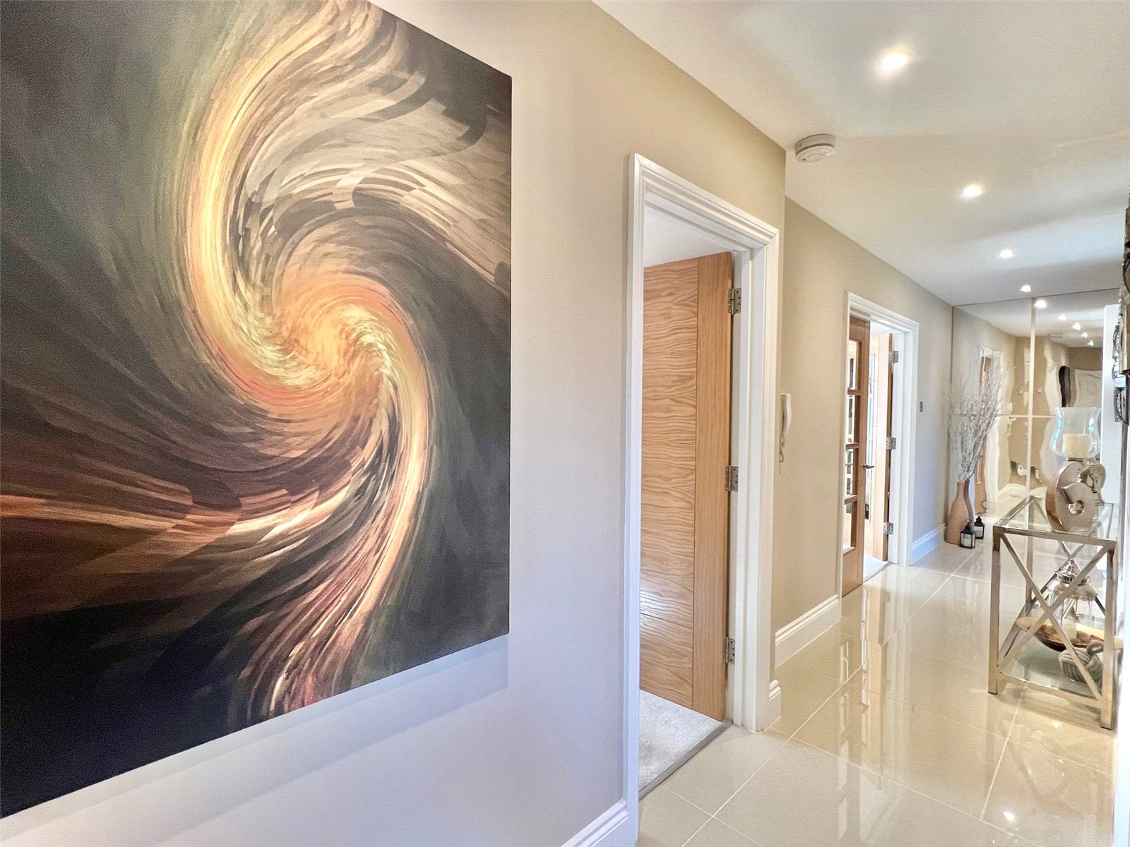Feature door, UPVC double glazed window, central heating radiator, recessed ceiling spotlighting with dimmer switch, two mirror fronted built-in wardrobes with a central feature doorway leading to: