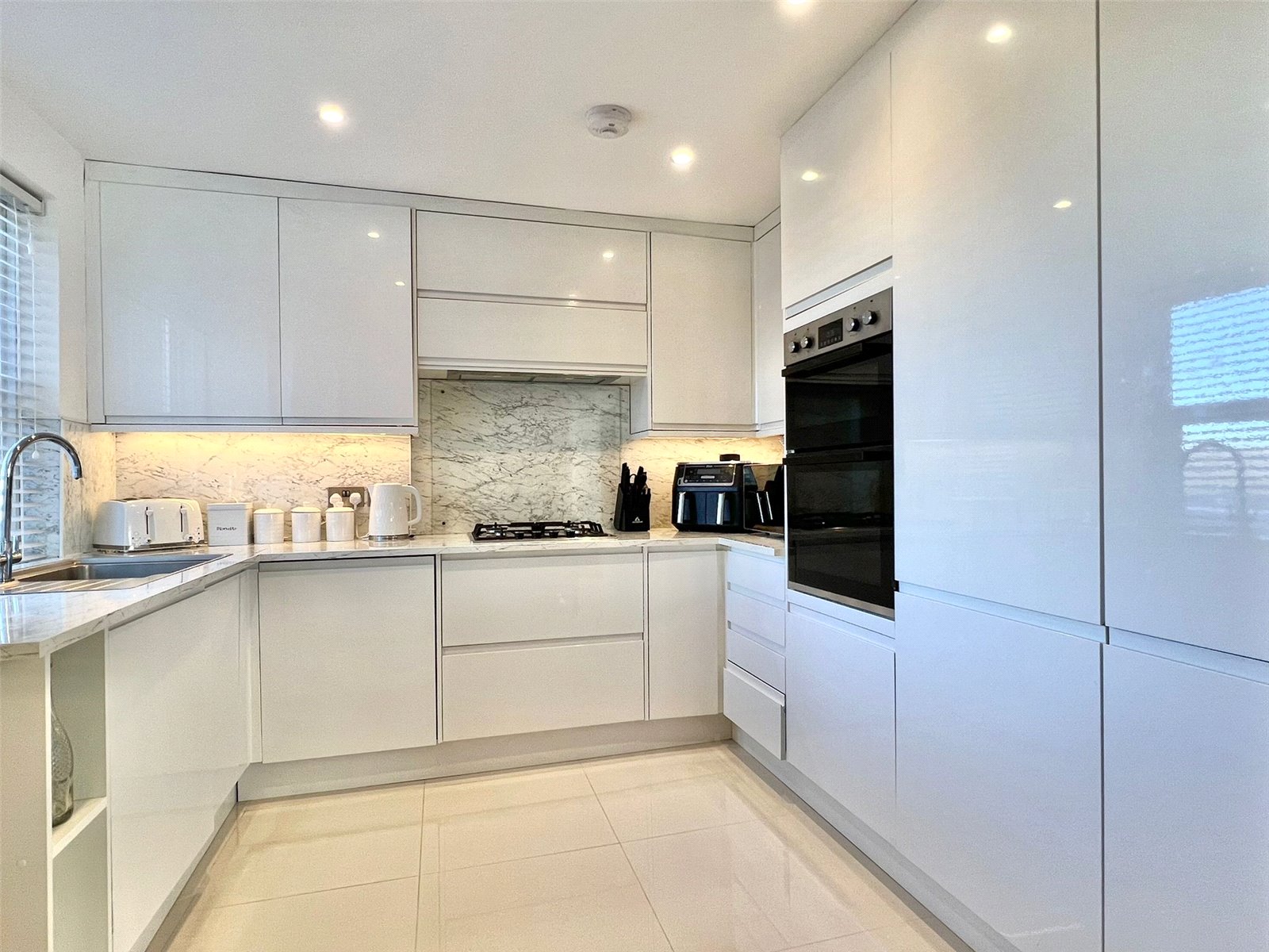 Modern fitted kitchen comprising single bowl, single drainer mixer tap stainless steel sink unit set in a work surface and matching splashback with base cupboard and drawer units and matching eye level cupboard units, integrated double oven with adjacent four ring gas hob and extractor over, integrated dishwasher and washer/dryer, integrated fridge/freezer, work surface lighting, UPVC double glazed window, ceramic tiled flooring, and recessed ceiling spotlighting