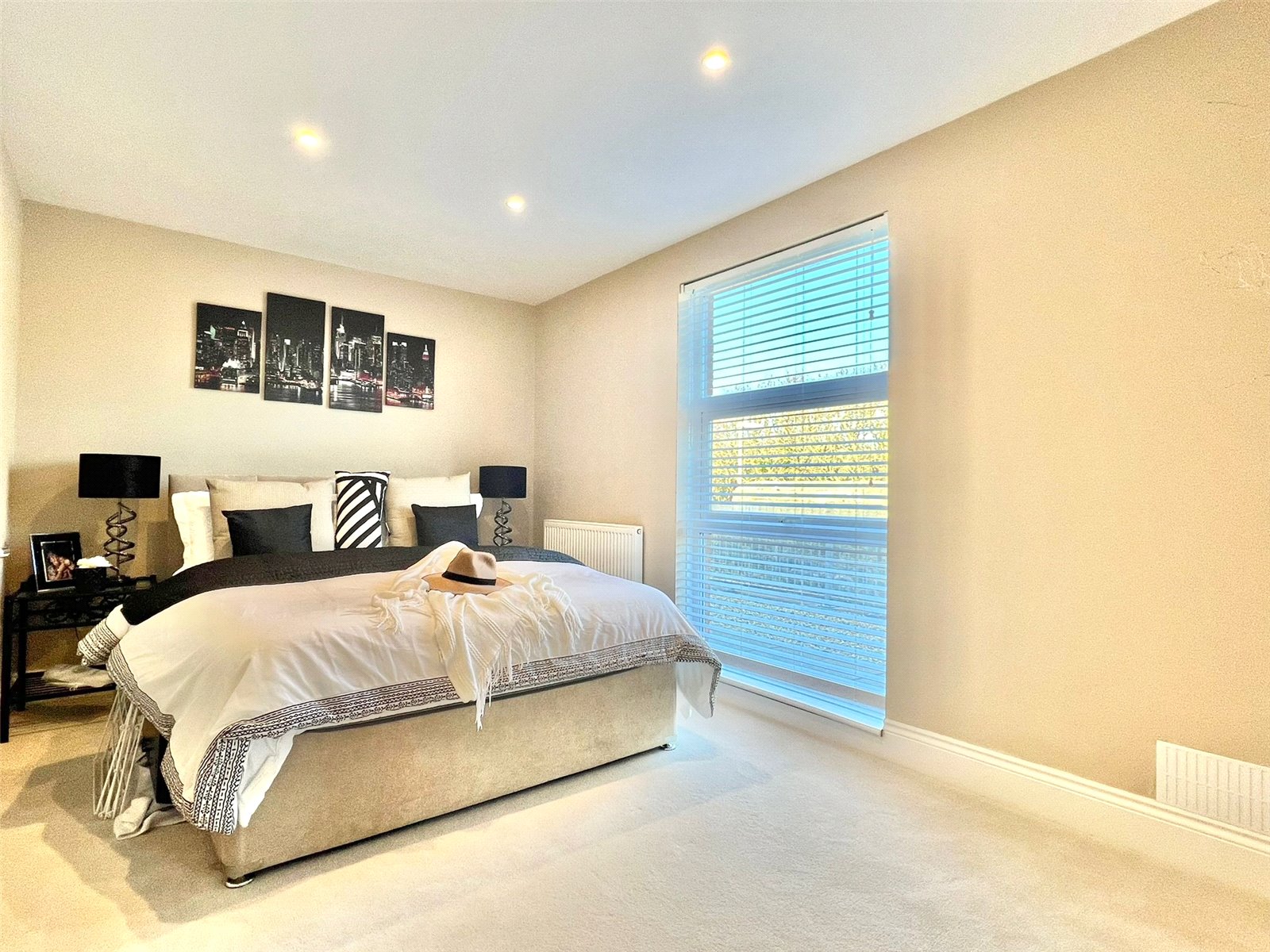 Feature door, UPVC double glazed window to the southerly aspect communal grounds, double and a single built in wardrobes, central heating radiator, recessed ceiling spotlighting with dimmer switch, TV point