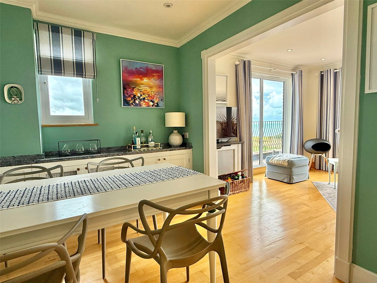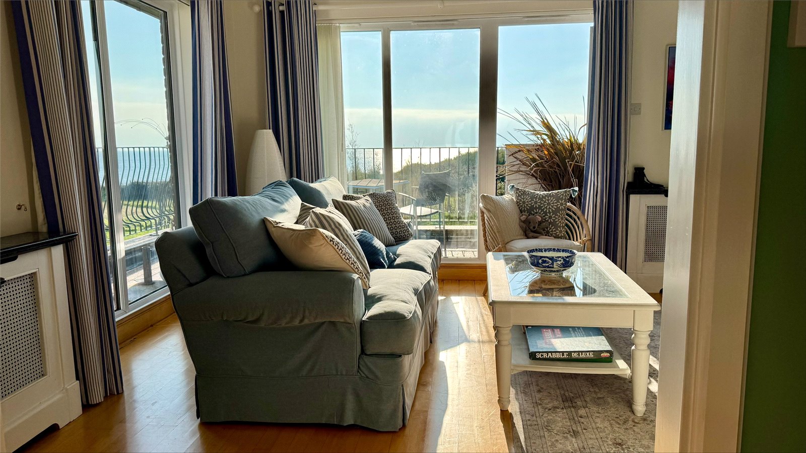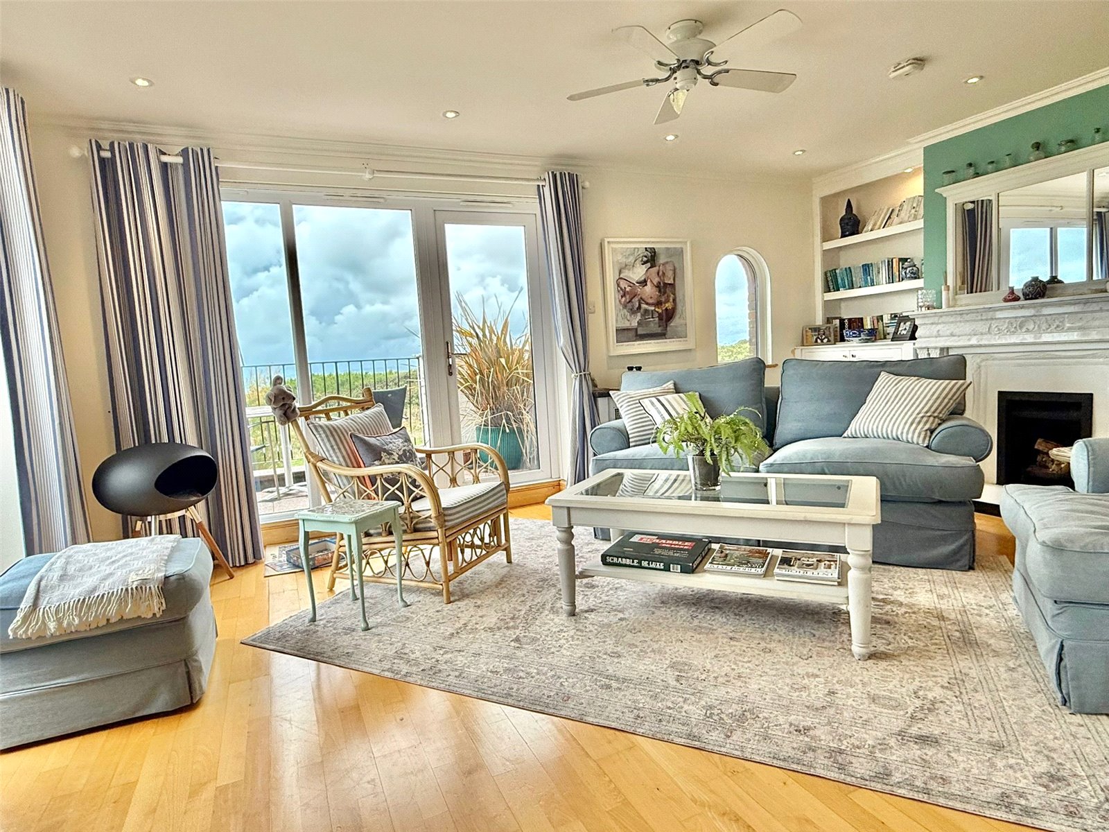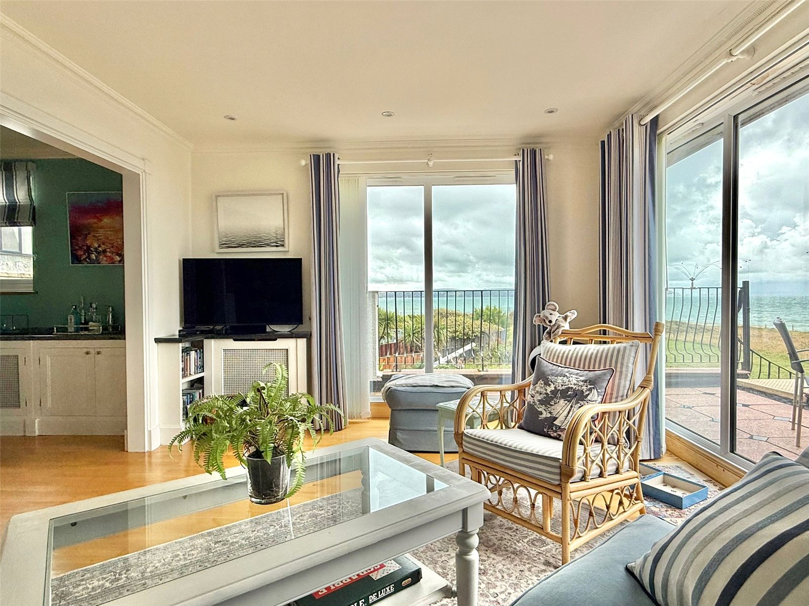 full height double aspect UPVC double glazed windows and doors overlooking and leading on to the Sun Balcony with an expansive outstanding Isle of Wight, Needles, Solent approach, clifftop vista to the South East through to Bournemouth Bay and the Purbecks in the West. The balcony has paved flooring, wrought iron balustrade and spiral staircase to the courtyard garden below, outside lighting. The Sitting Room has a central feature fireplace with a marble mantel and surround, adjacent base level storage cupboard units with shelving and lighting over, recessed ceiling spotlighting, central heating radiators, TV point, and free flowing access to: