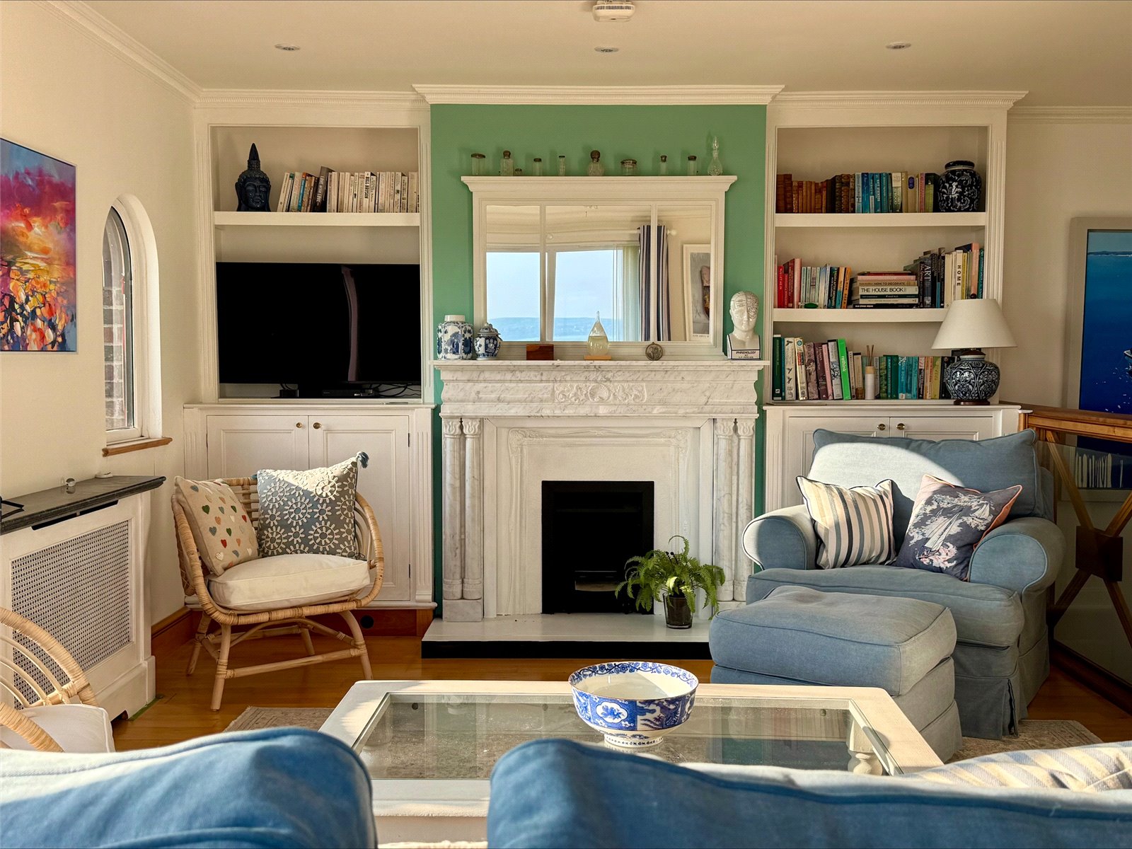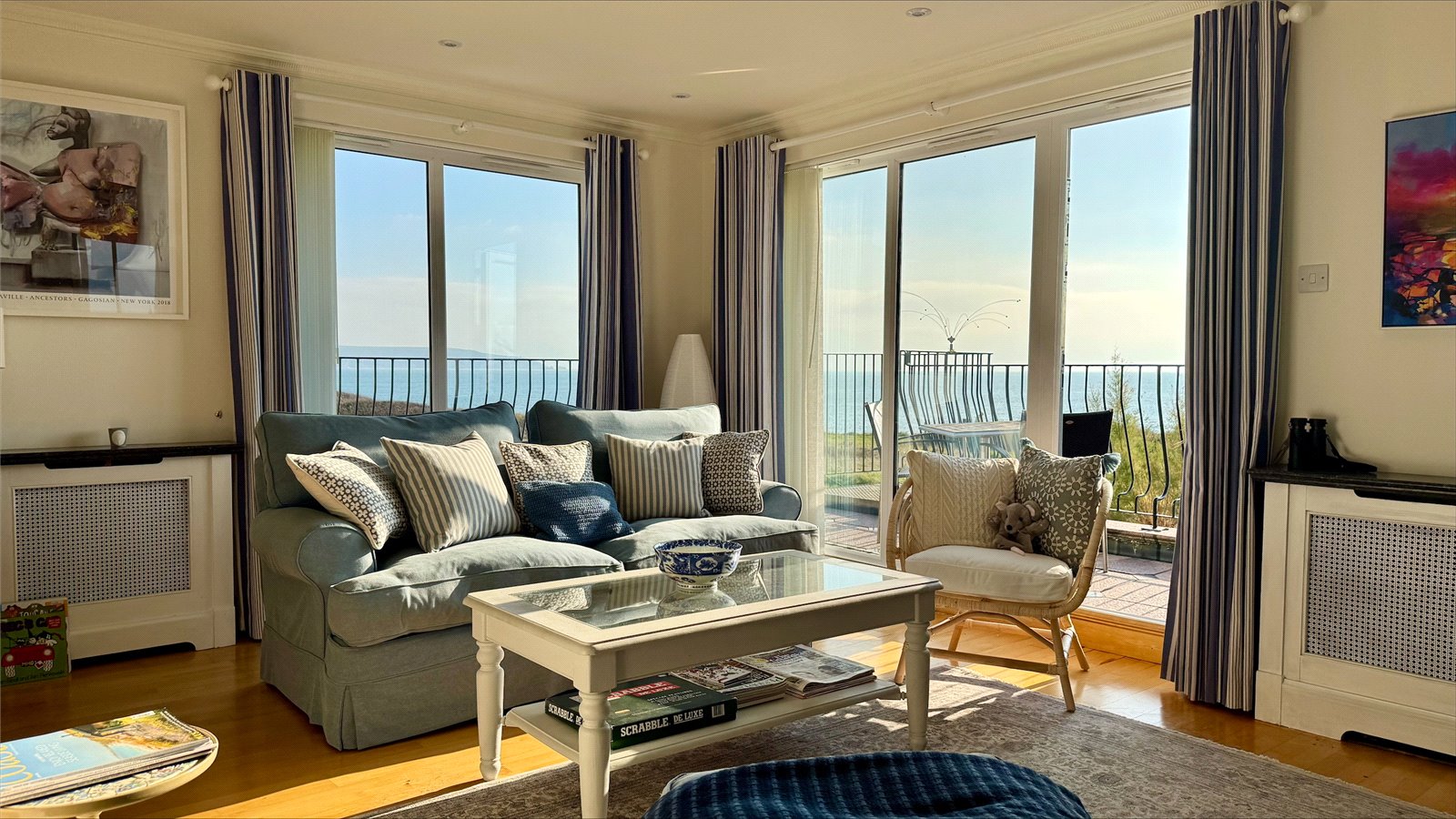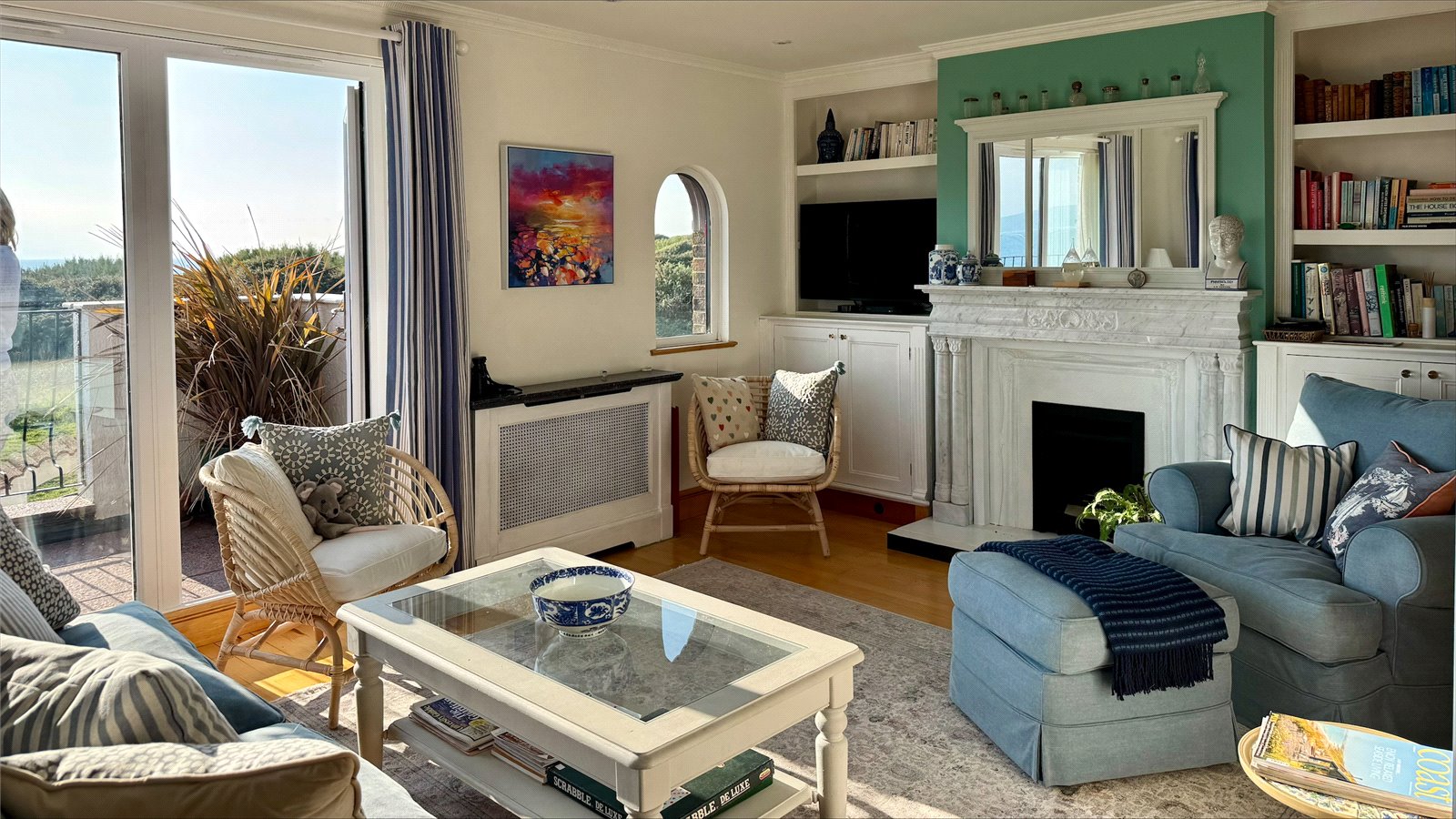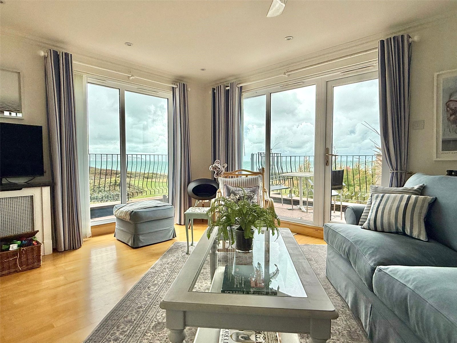 full height double aspect UPVC double glazed windows and doors overlooking and leading on to the Sun Balcony with an expansive outstanding Isle of Wight, Needles, Solent approach, clifftop vista to the South East through to Bournemouth Bay and the Purbecks in the West. The balcony has paved flooring, wrought iron balustrade and spiral staircase to the courtyard garden below, outside lighting. The Sitting Room has a central feature fireplace with a marble mantel and surround, adjacent base level storage cupboard units with shelving and lighting over, recessed ceiling spotlighting, central heating radiators, TV point, and free flowing access to: