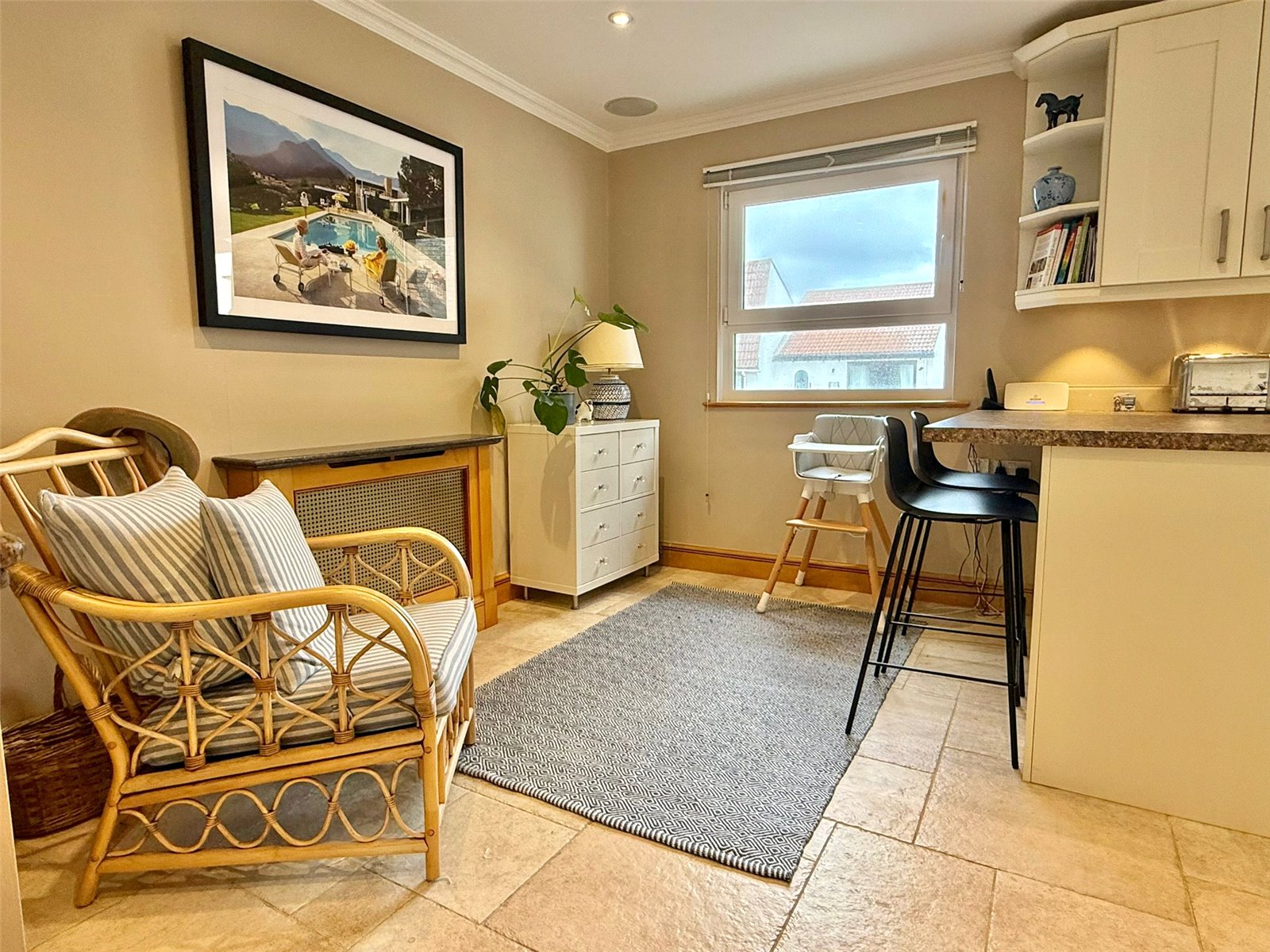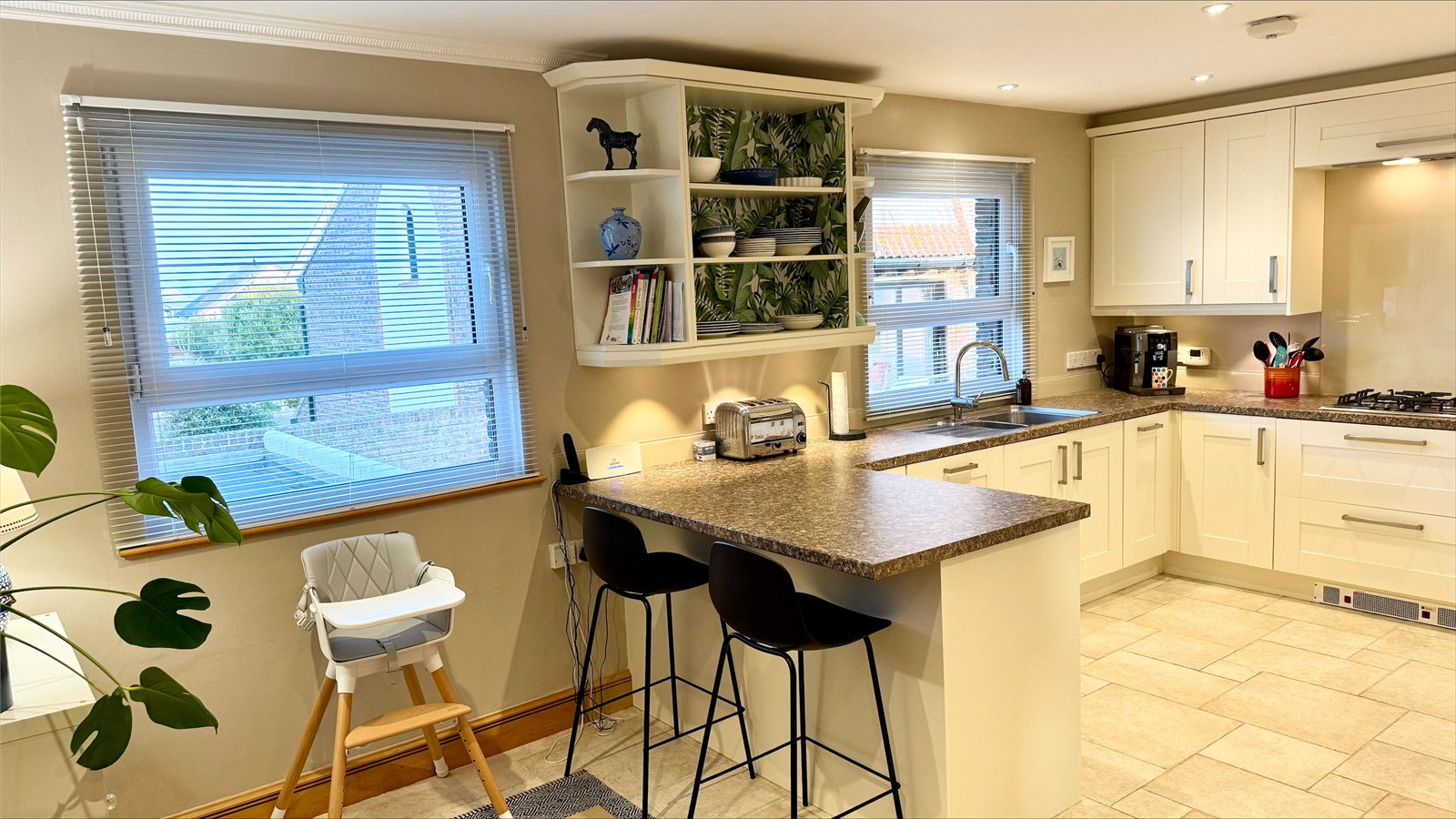 UPVC double glazed door and adjacent window overlooking and leading on to the courtyard garden, recessed ceiling spotlighting, central heating radiator