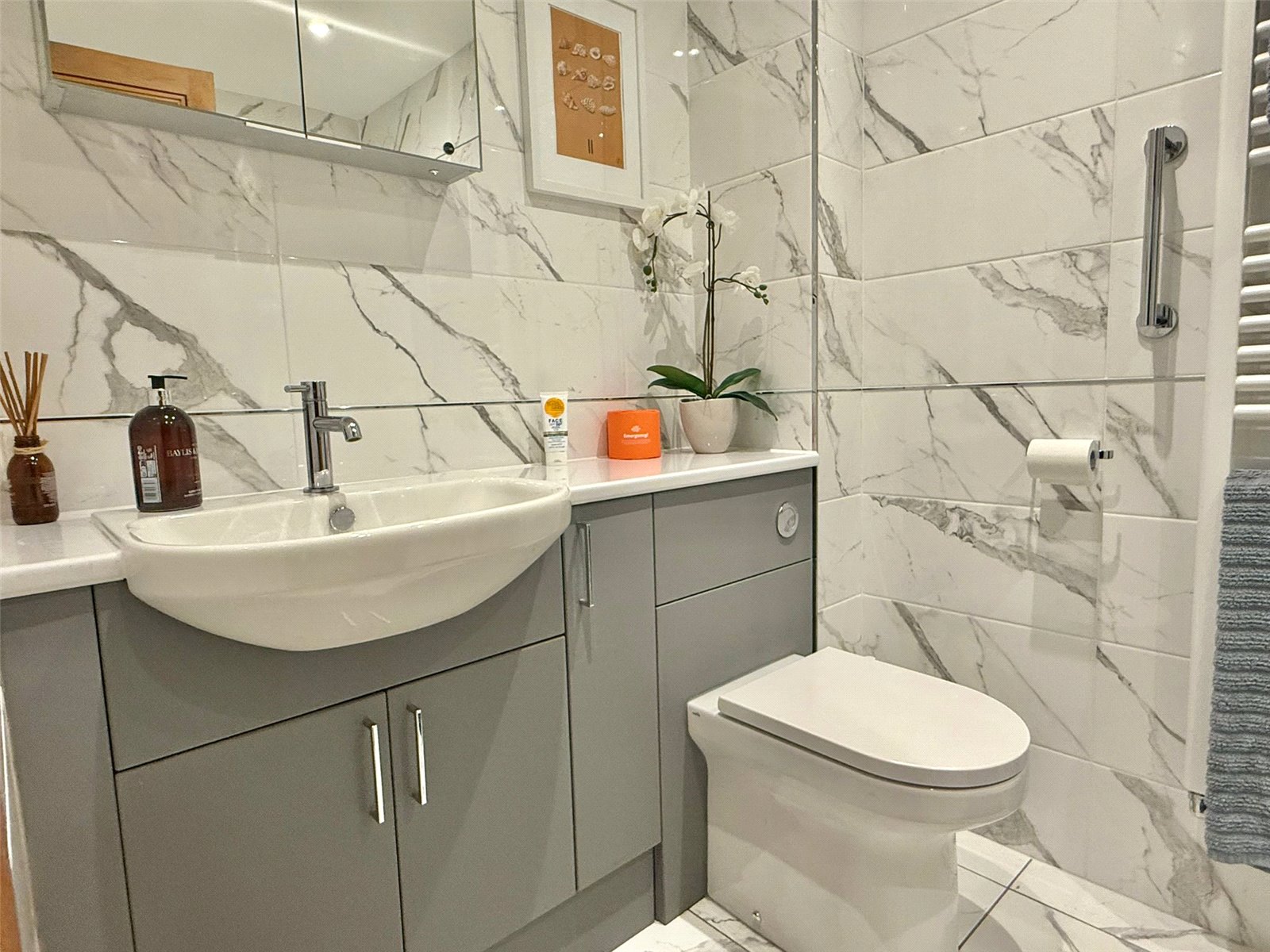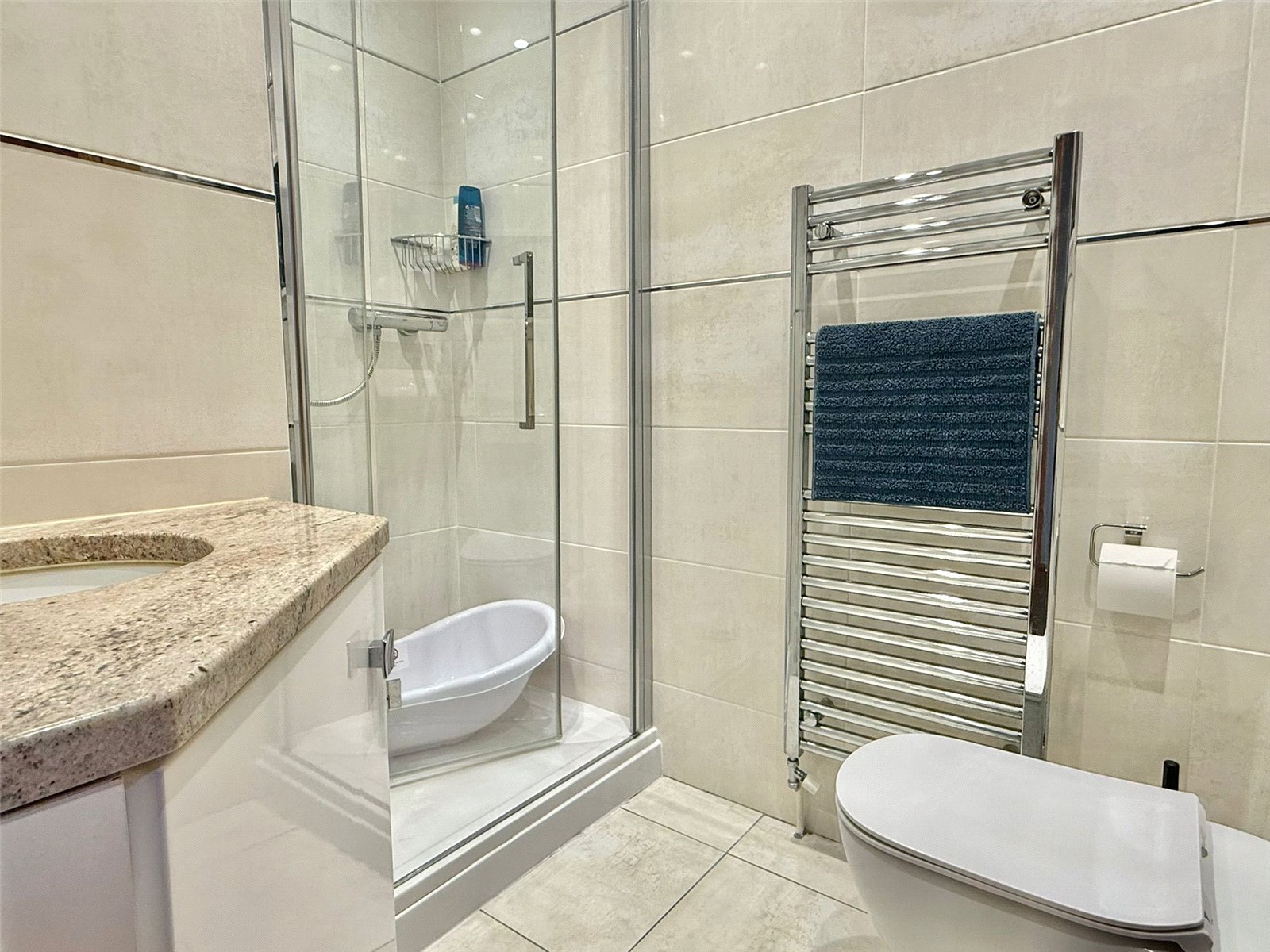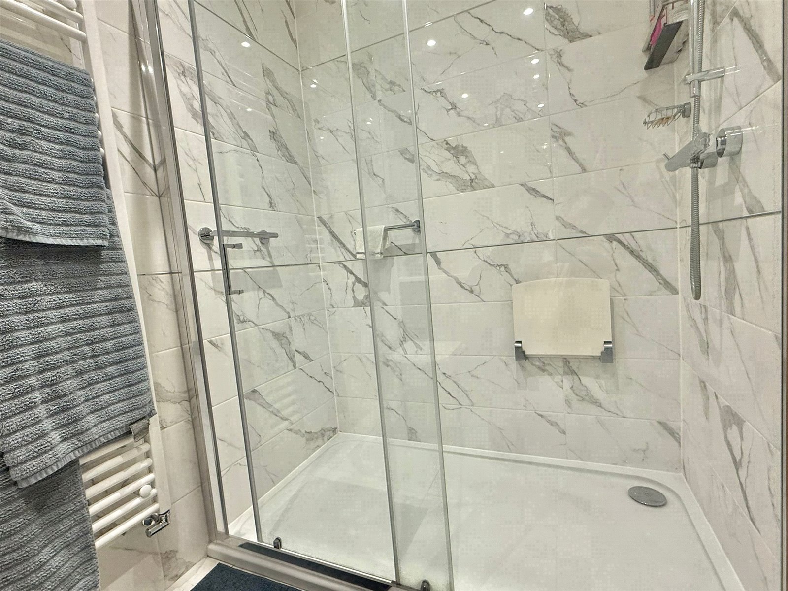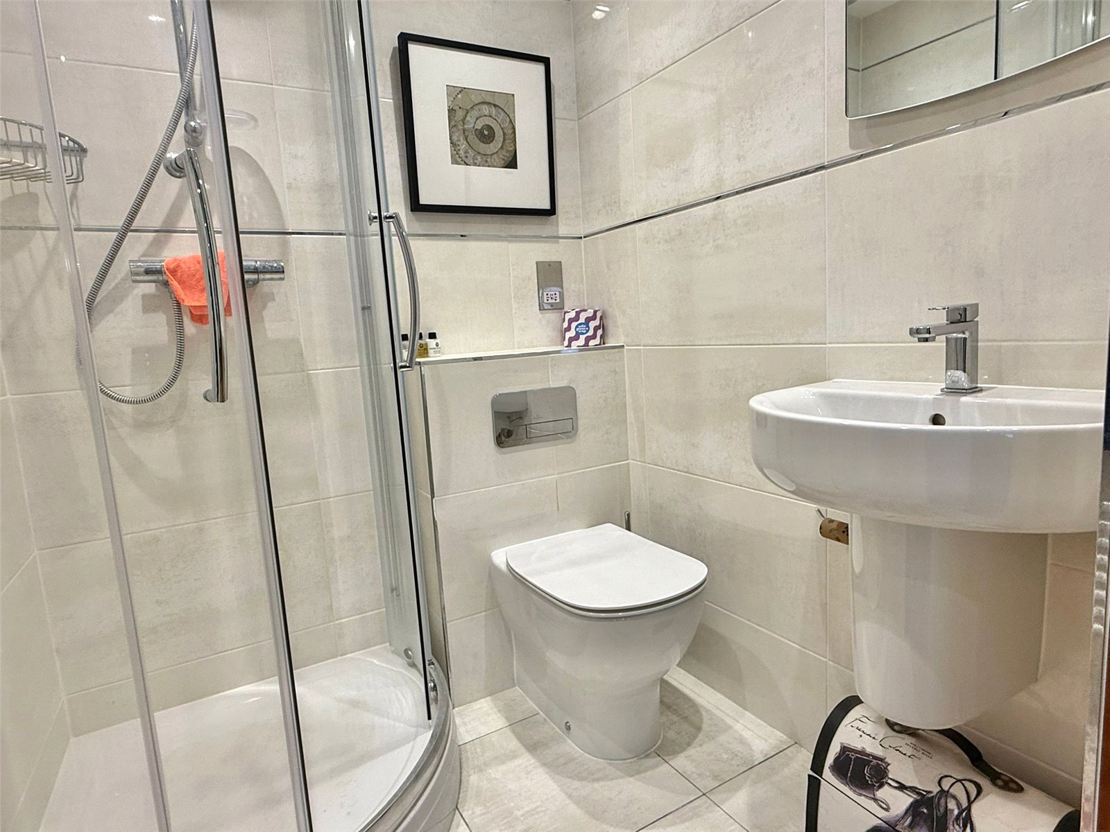 shower, concealed cistern wc, vanity wash hand basin, fully tiled floor and walls, heated towel rail, recessed ceiling spotlighting, extractor