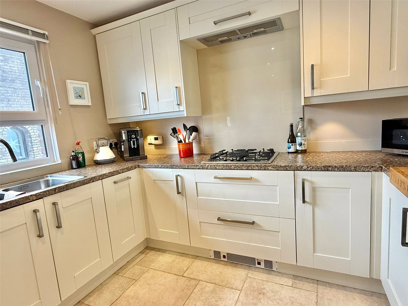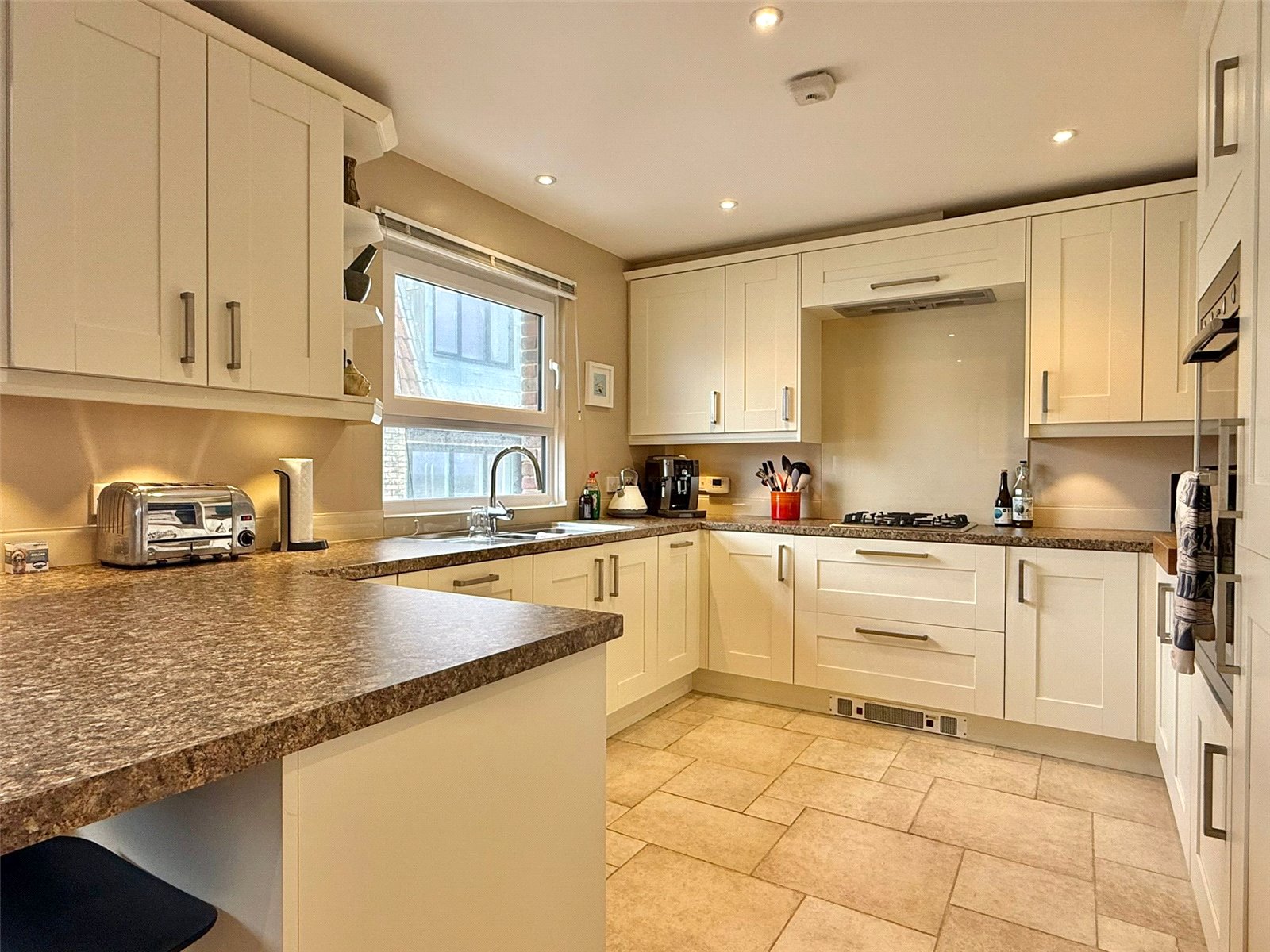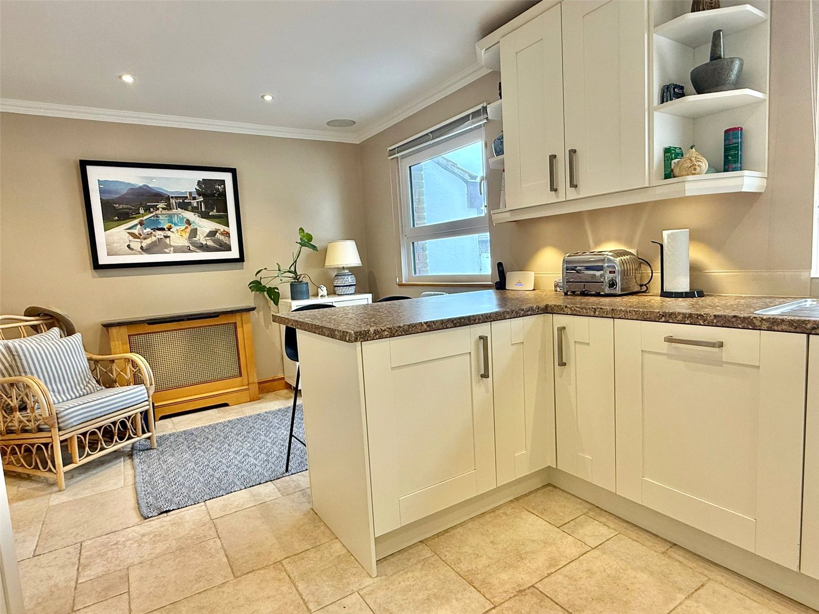 with UPVC double glazed window, recessed ceiling spotlighting, central heating radiator with granite display surface over, further fitted base level storage cupboards