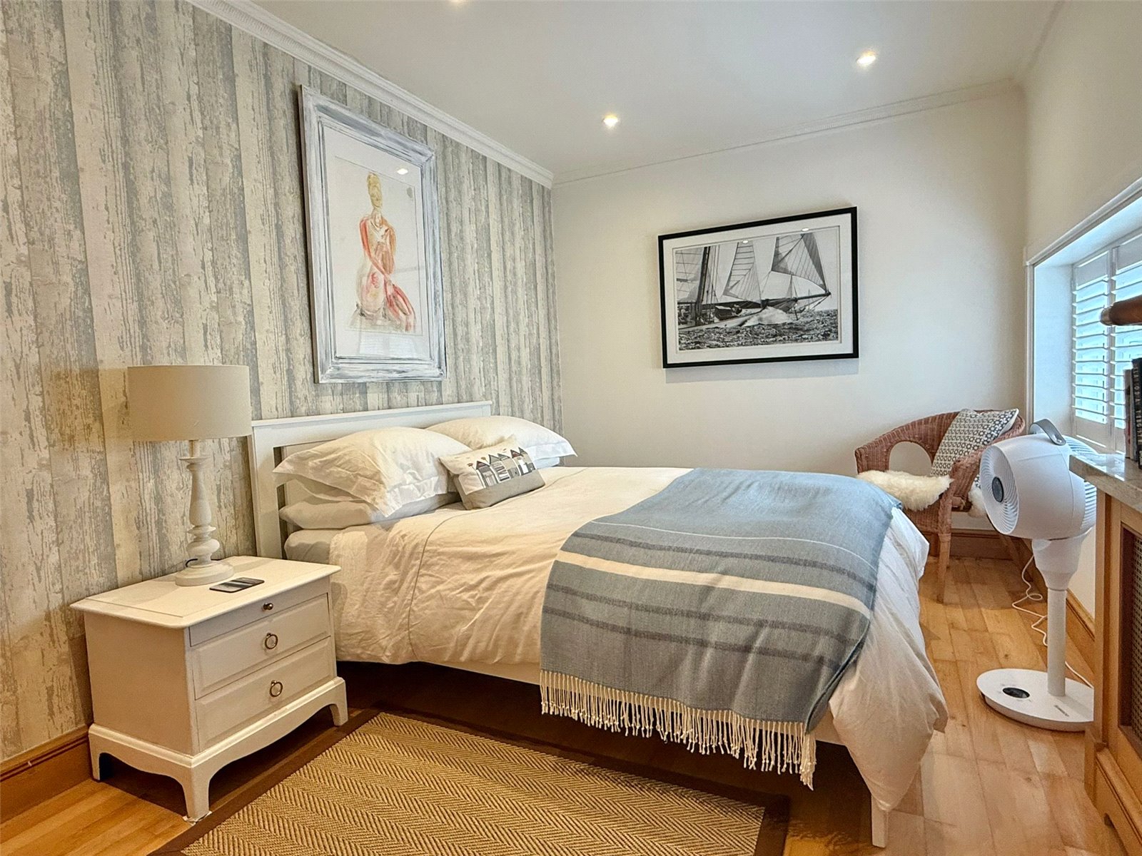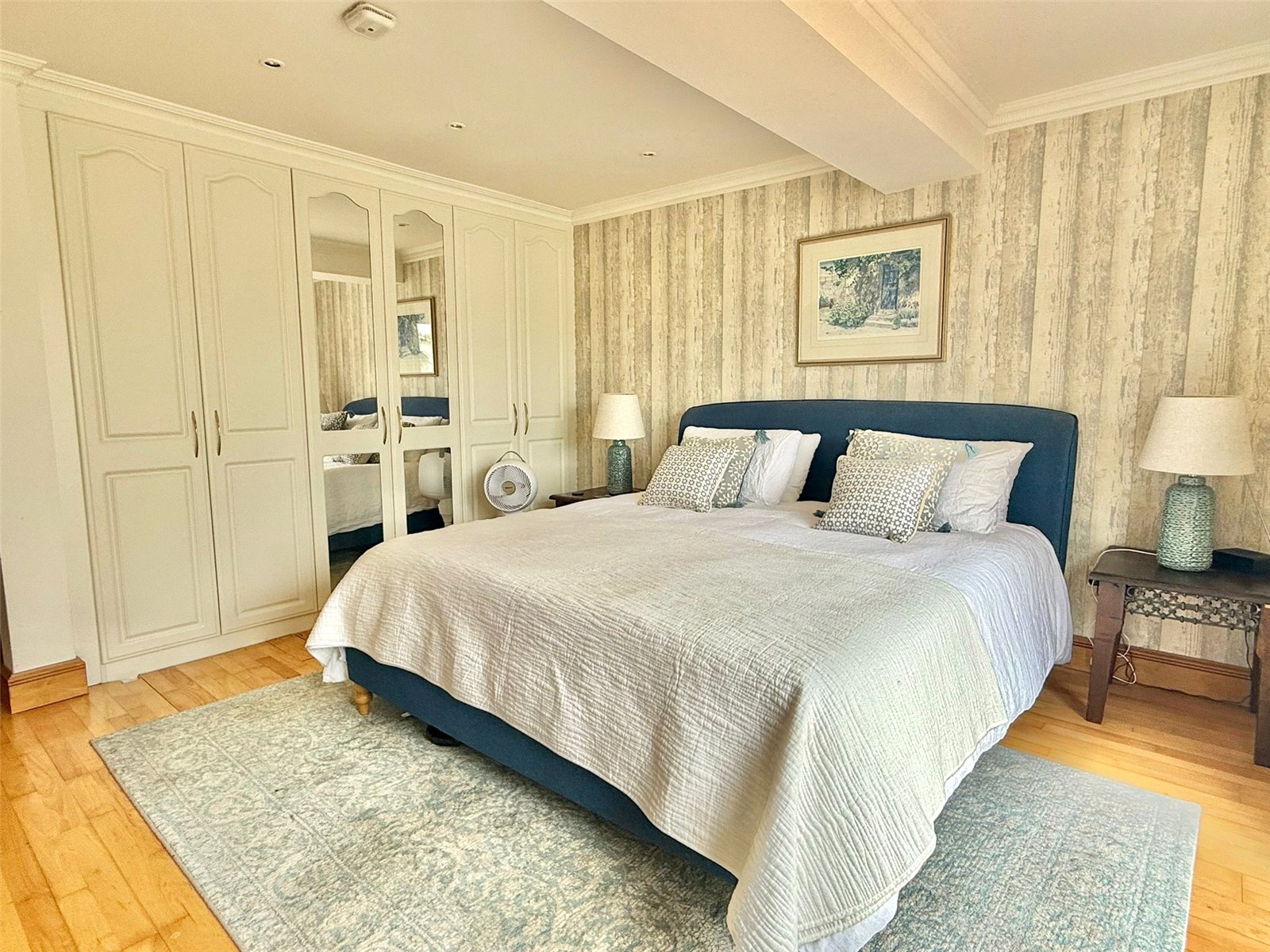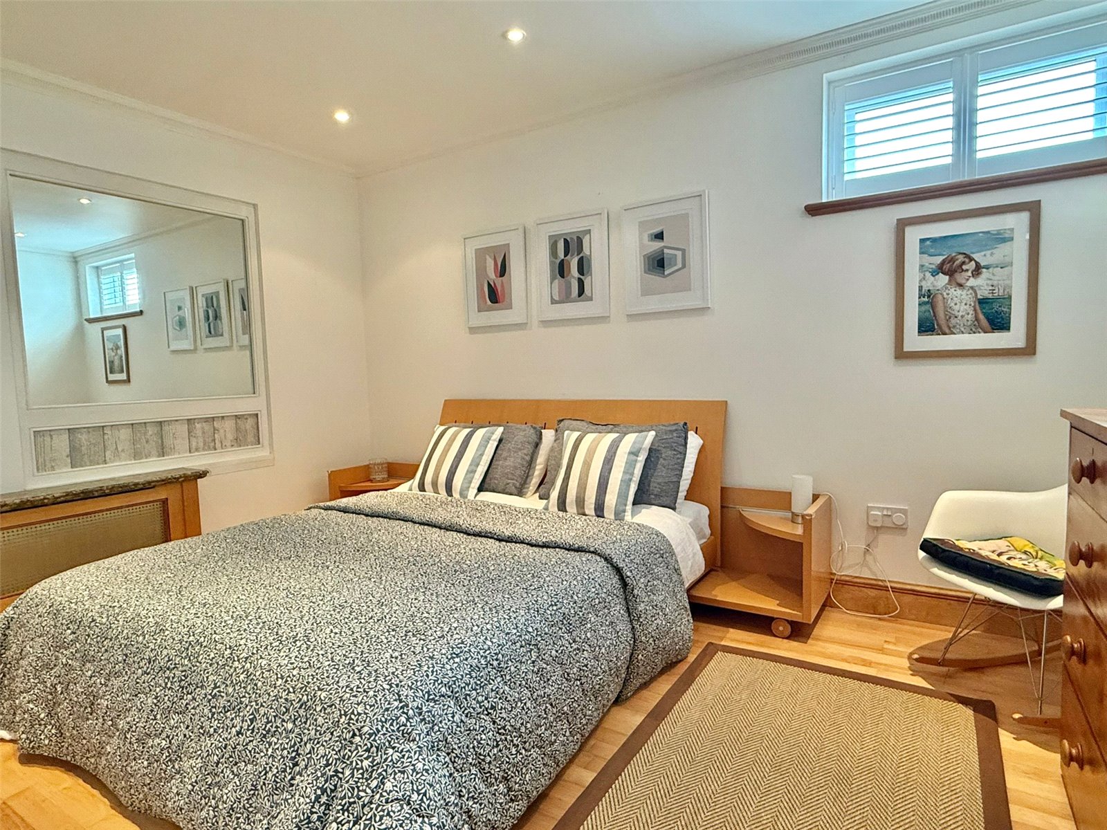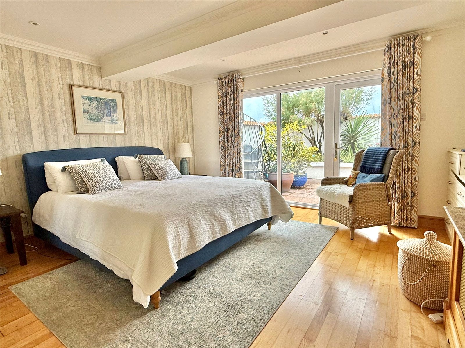 with central heating radiator, fitted bedroom furniture to include three double wardrobes and chest of drawers, recessed ceiling spotlighting, UPVC double glazed full height windows and door overlooking and leading on to the courtyard garden, further double wardrobe adjacent to the entrance to the ensuite