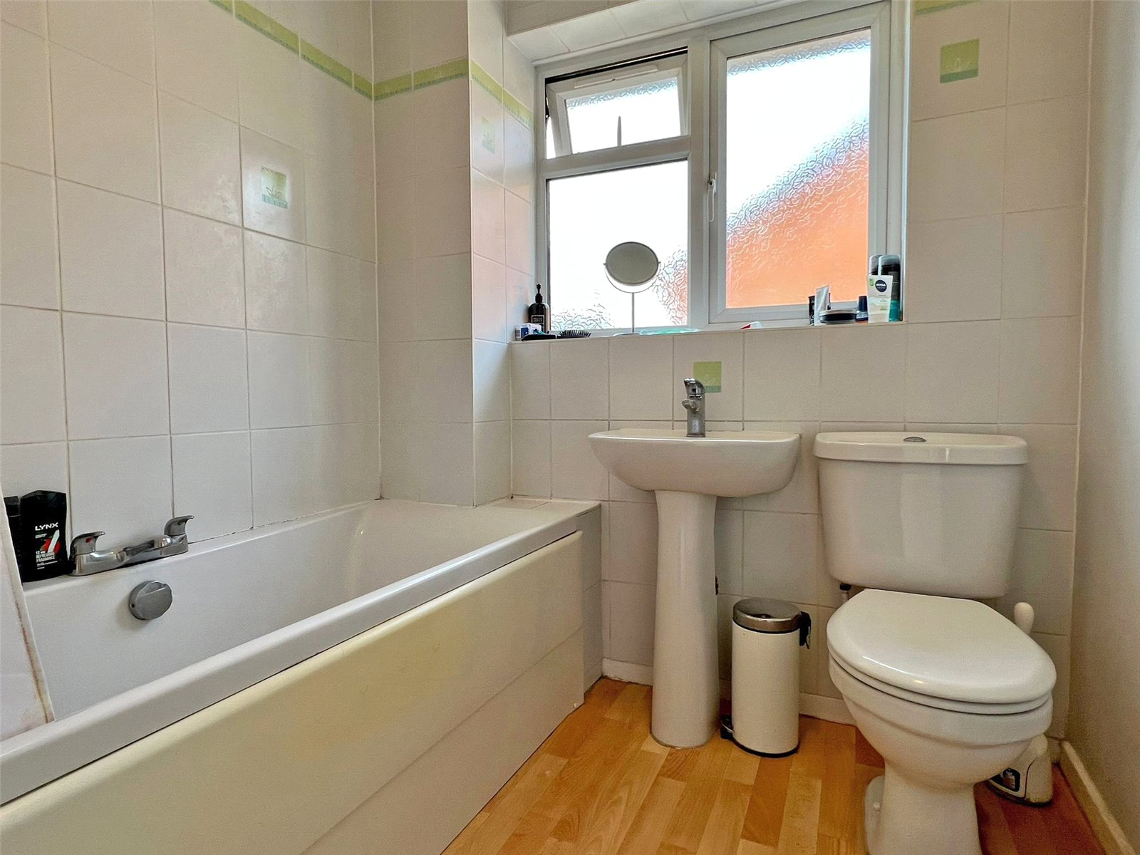 Comprising bath with fitted shower, wc, wash hand basin, heated towel rail, ceiling light point, obscure UPVC double glazed window
