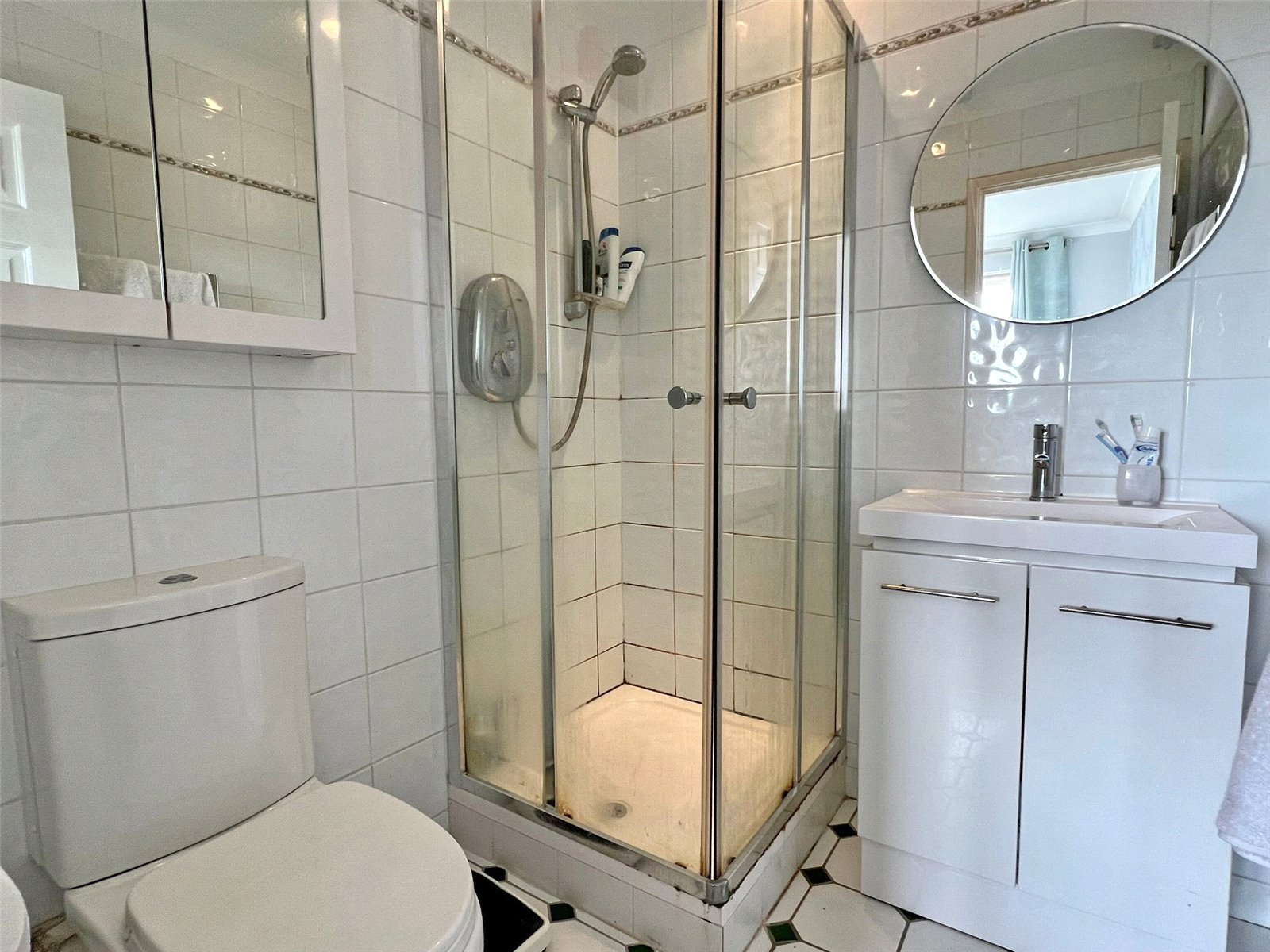 Comprising shower, wc, vanity wash hand basin, heated towel rail, tiled floor and walls, recessed ceiling spotlighting