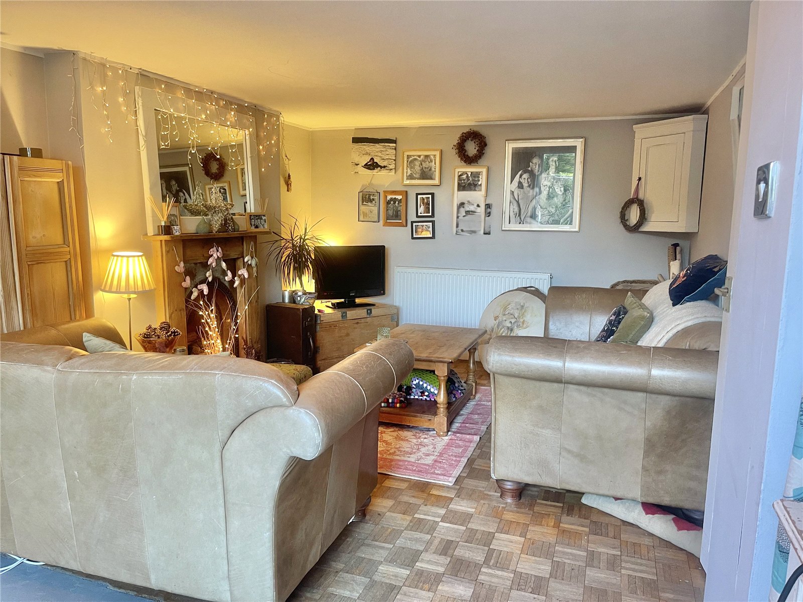 Cast iron fireplace with timber surround, radiator, woodblock flooring, double glazed door to garden.
