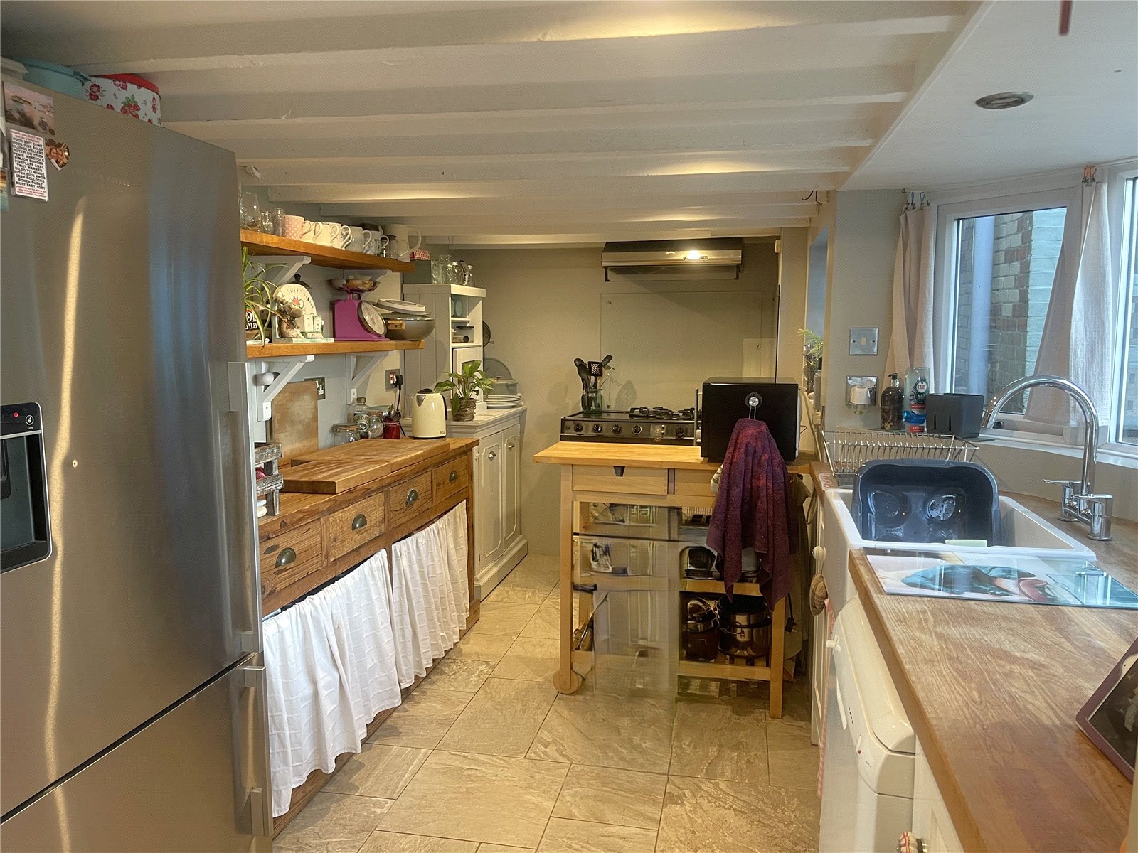 Comprising freestanding units, range cooker with extractor over, butlers sink unit with space and plumbing for dishwasher, colour washed cupboards and wood beams, tiled floor space for fridge freezer, radiator (Low ceiling)