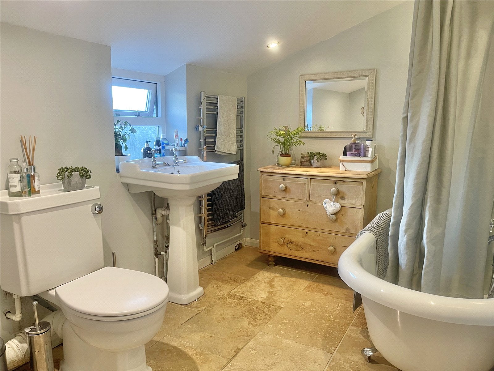 Comprising roll top bath with mains shower over, wc, wash basin, towel rail and tiled floor.