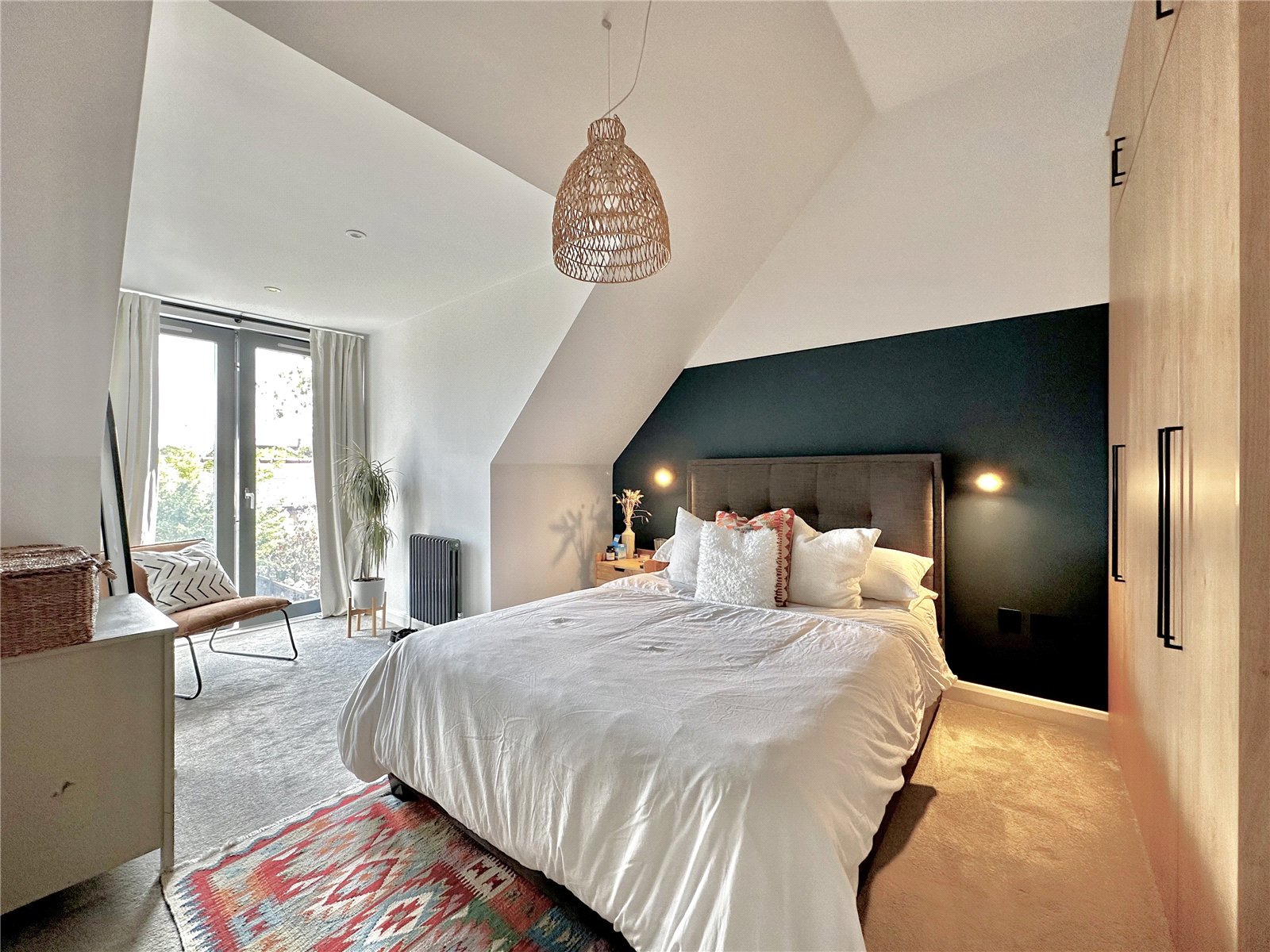 Vaulted ceiling and a range of wardrobe cupboards, wall light points and double doors to Juliet balcony, vintage radiator.
