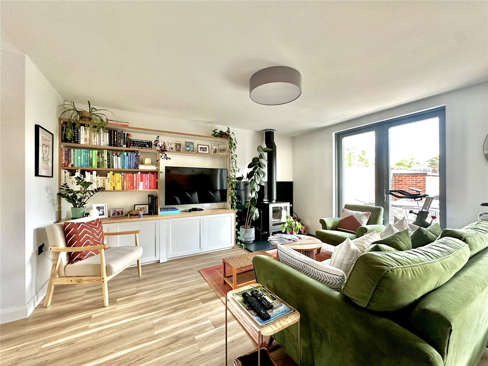 Sitting/Dining Room 23’7 x 14’9 – Wood burning stove and adjacent shelving unit with cupboard below and recess suitable for flat screen television, two sets of double doors to garden, Amtico oak flooring, downlighters, leading to