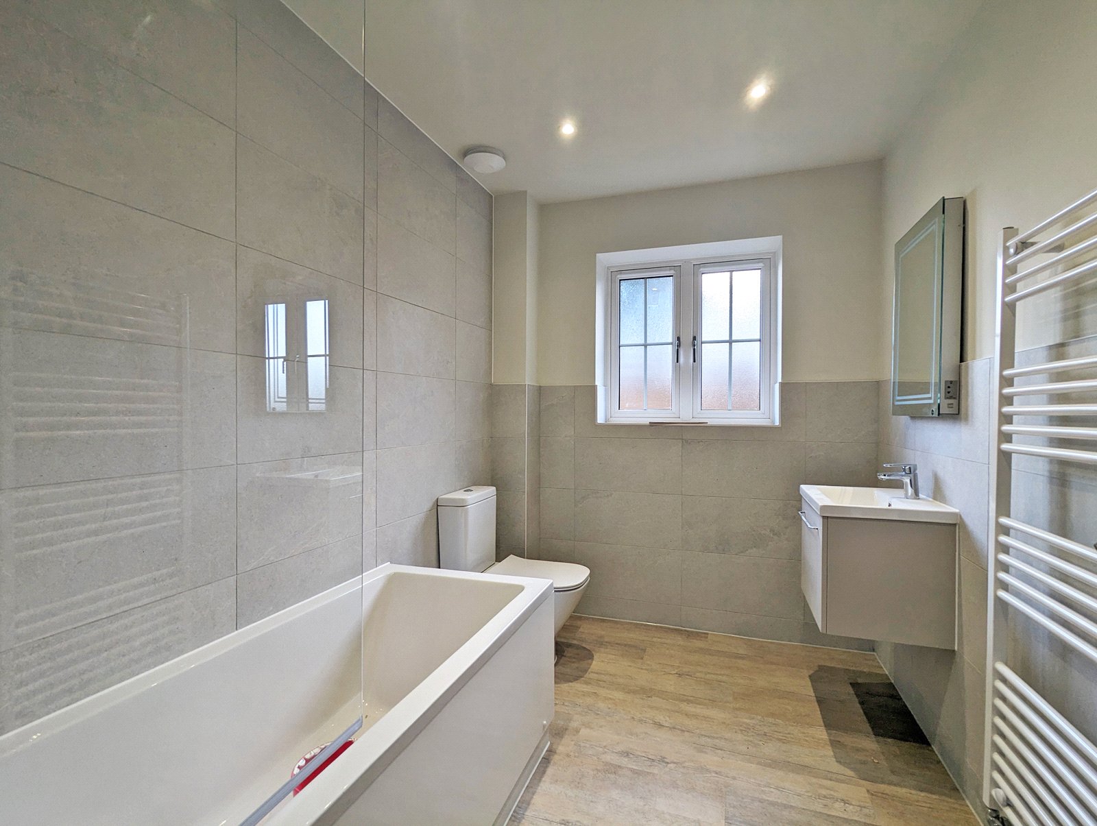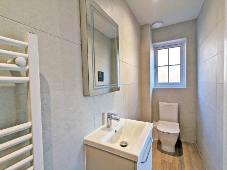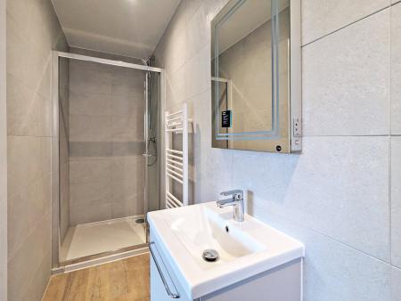 The principal bedroom benefits from a stylish en-suite shower room with a large glazed shower enclosure, modern tiling, chrome fixtures and an LED-lit mirror unit.