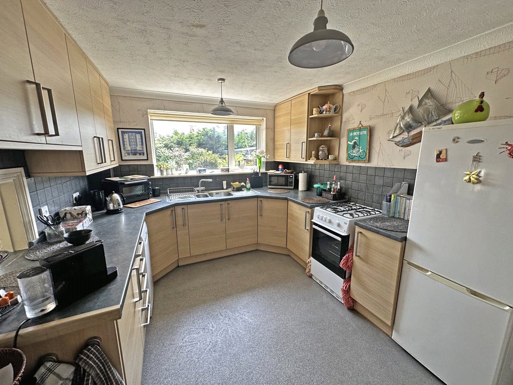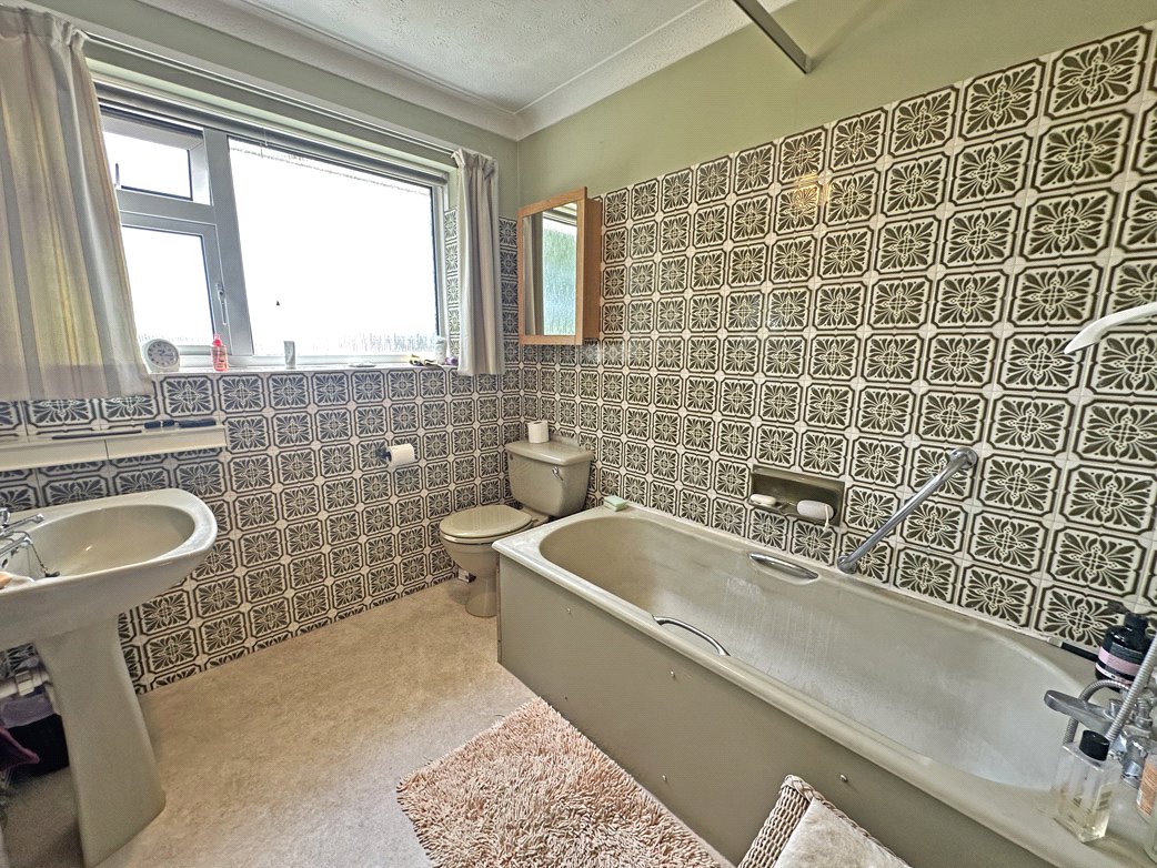 The kitchen comprises a good range of cupboards and drawers with roll edge worktops. There is a tiled splashback, hatch to dining room and large window overlooking rear gardens. There is further space for gas oven, slimline dishwasher and fridge freezer.