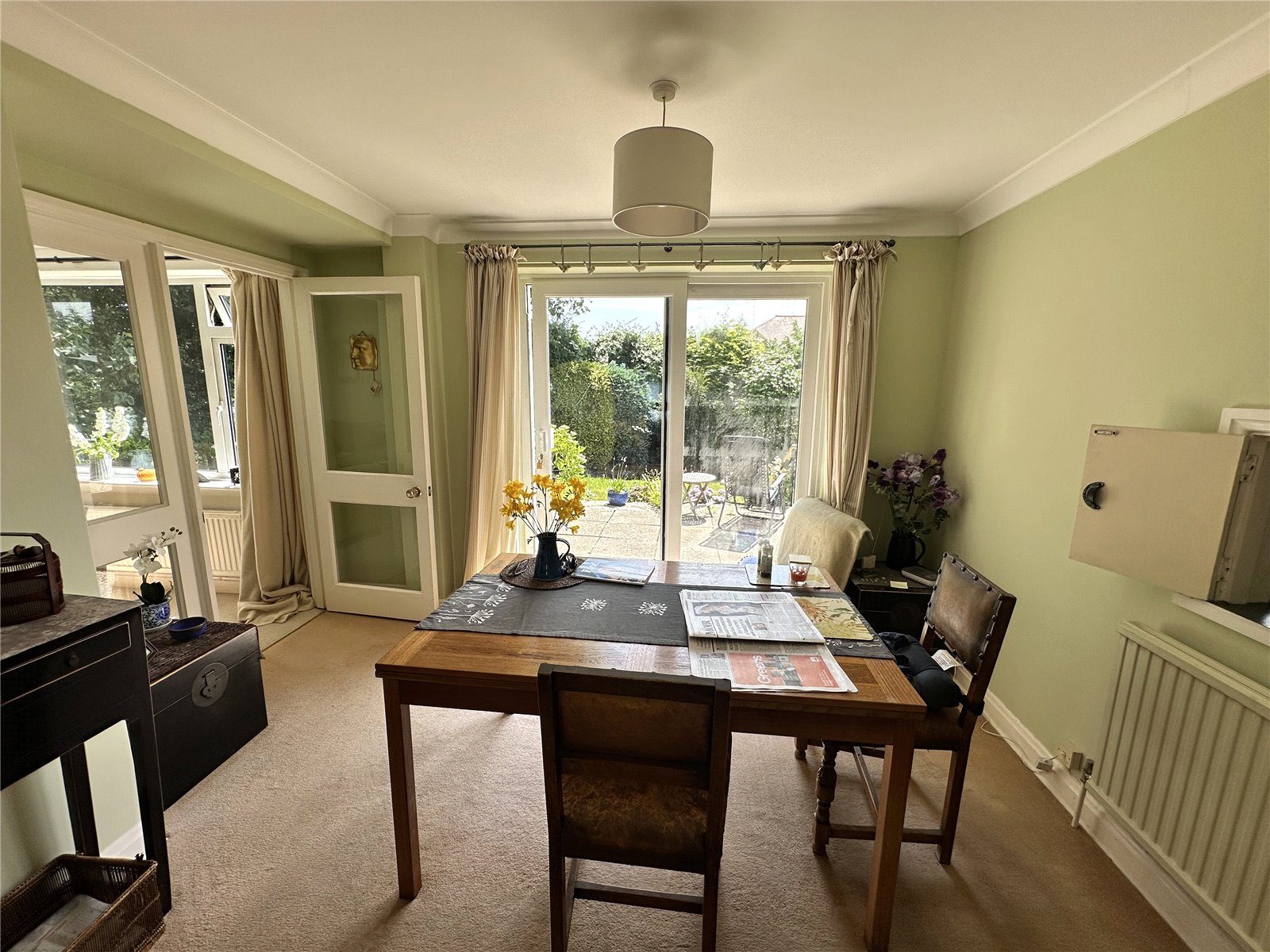 A wooden glazed door with matching side panel leads into the dining room with sliding patio door which leads to the rear gardens. You can also access the dining room via the entrance hallway.