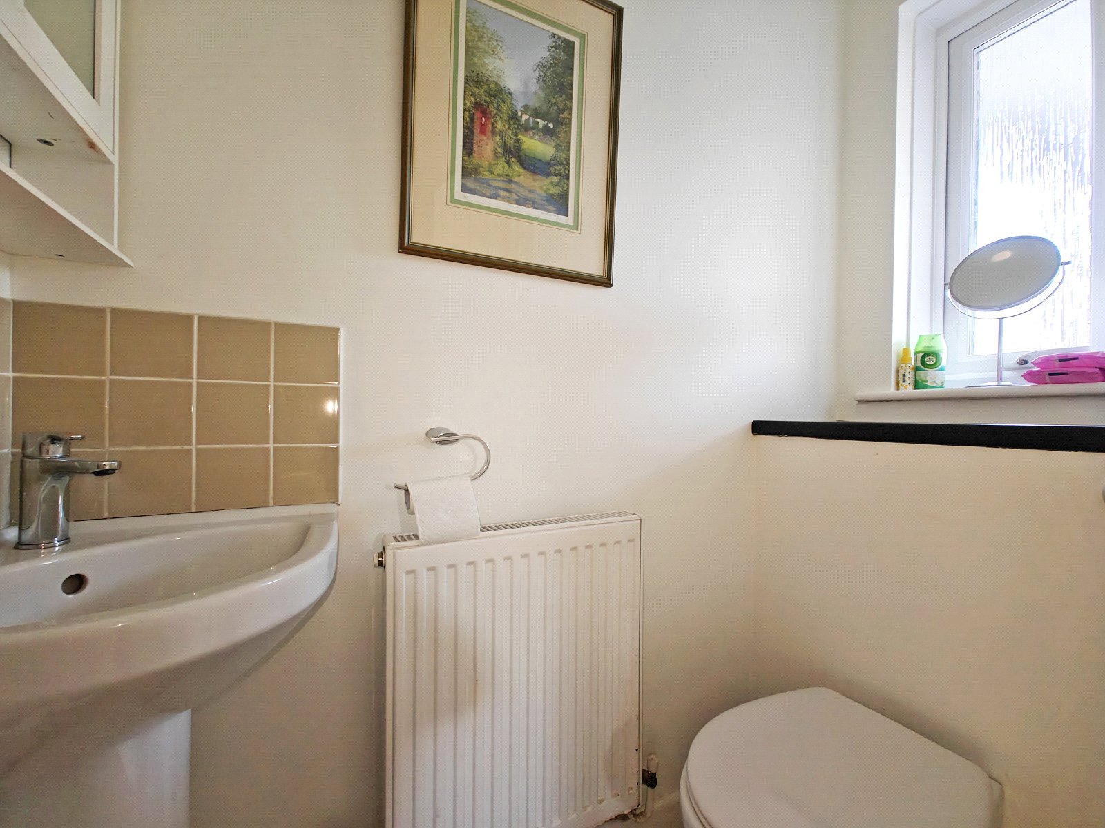 The home opens into an enclosed porch and then into a bright hallway featuring practical understairs storage and a cloakroom with WC.