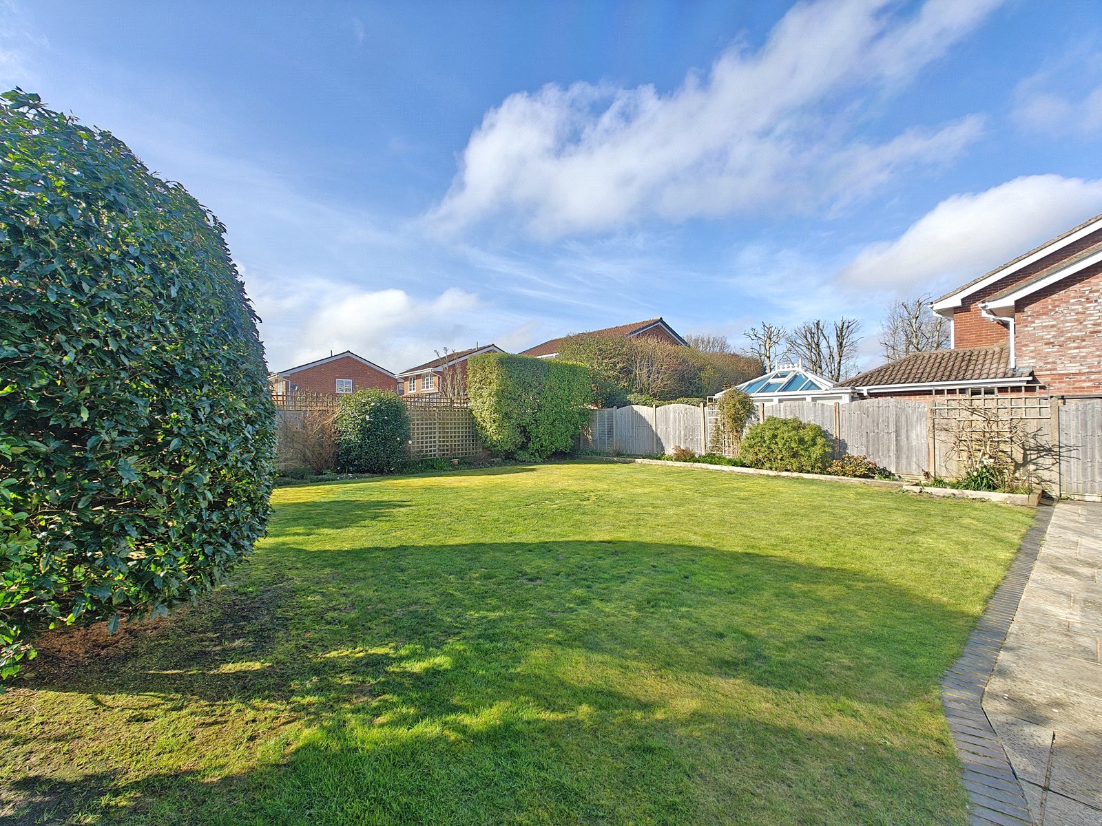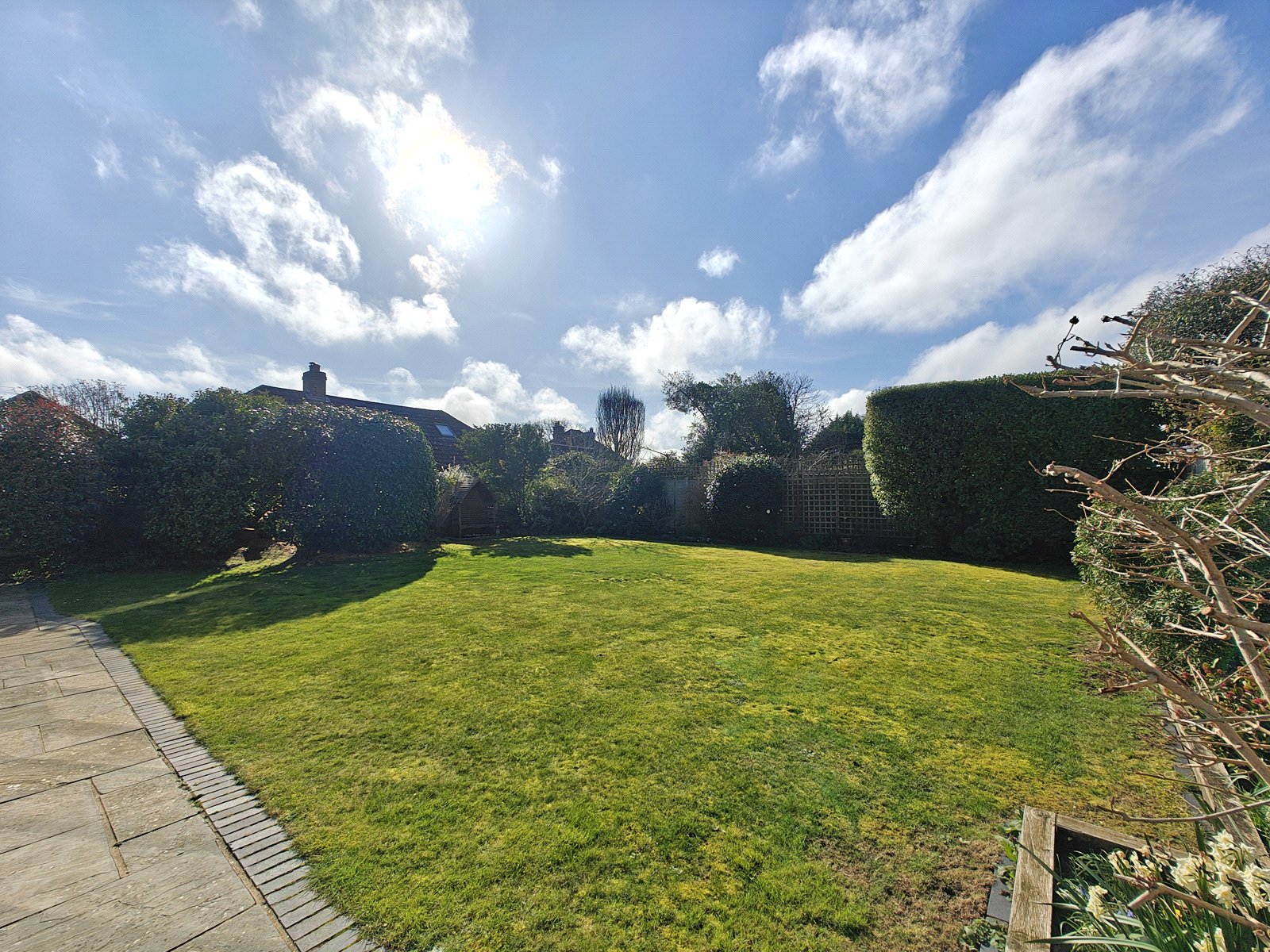 The Main Garden: A superb South-West facing wrap-around garden, featuring premium sandstone paving and lush lawn areas.