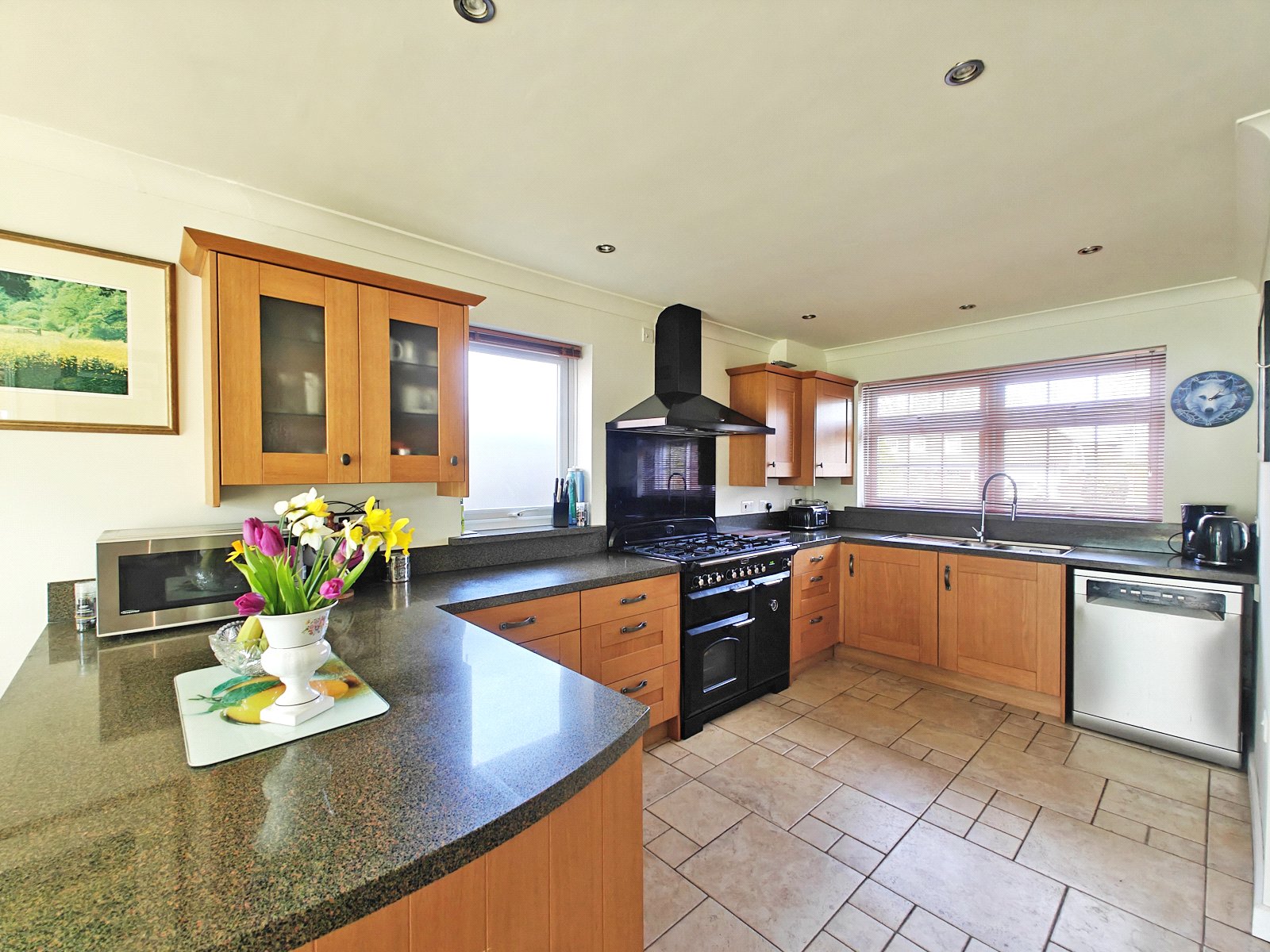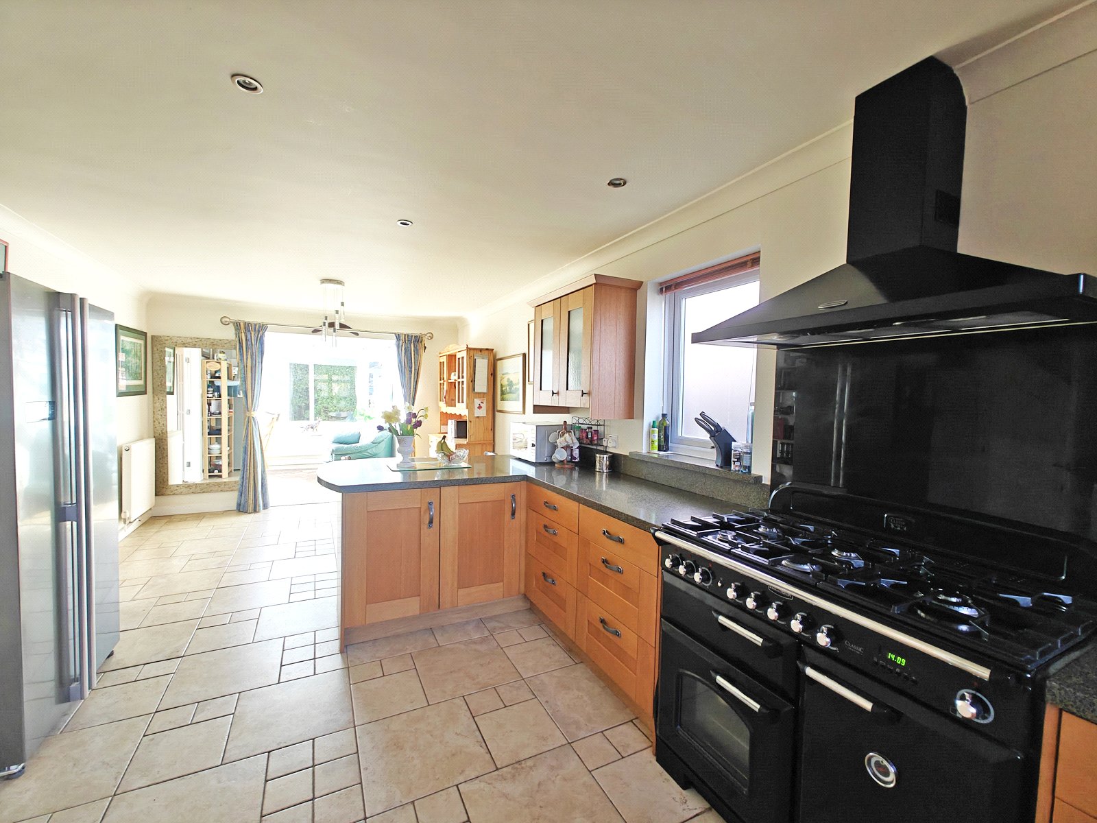 A bright, open-plan kitchen/dining area. It’s a chef’s space, boasting a freestanding range-style gas oven with fitted extractor above, space for an American-style fridge/freezer, and space and plumbing for a dishwasher.