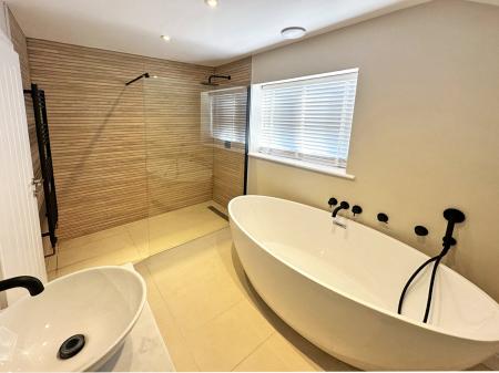 Bedrooms two and three are serviced by the beautifully appointed main bathroom with stunning separate shower unit with rainfall shower and superb freestanding bath with handheld shower, There is also a contemporary wash hand basin with wall mounted mirror above with led lighting built in and window overlooking rear aspect.