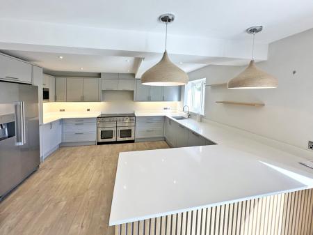 The kitchen boasts an excellent range of quartz worktops with matching splashback and an excellent range of contemporary built in base cupboards and drawers with matching wall mounted units. Integrated appliances include a large electric range style cooker with fitted extractor over, dishwasher, wine cooler and eye level microwave oven. There is space for an American style fridge freezer with fitted pull out pantry cupboards either side. The breakfast bar gives good space for informal dining and there is a window overlooking rear aspect.