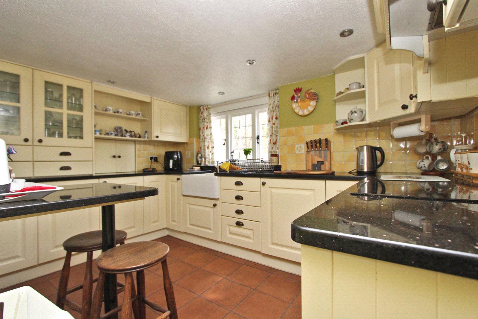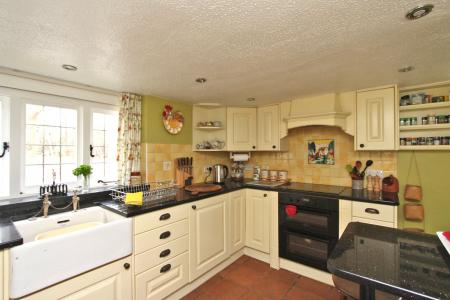 Plus recess. Well fitted with drawers and cupboards under granite worktops. Deepware sink with cupboard under. Double glazed diamond leaded front aspect window above. Matching granite window cill. Built-in Hotpoint oven. John Lewis four ring ceramic hob and concealed extractor above. Integrated fridge. Serving hatch to dining area. Matching eye-level cupboards incorporating glazed display cabinets with set of drawers under. Recessed integrated freezer with space for trays to side, granite worktop over and shelving above. Walls tiled between units. Double glazed UPVC side aspect window. Recessed downlighters.