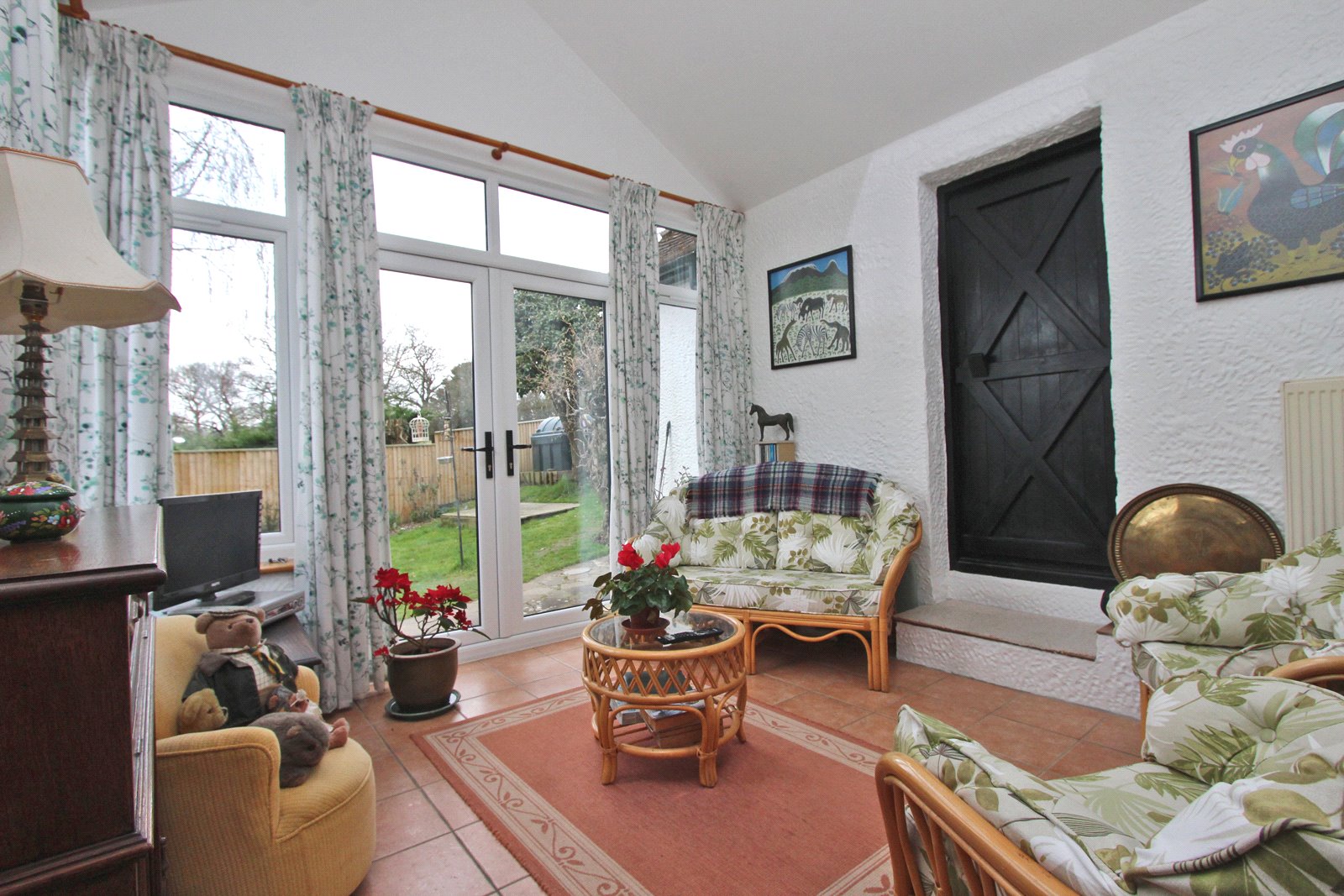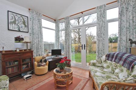 Tiled floor. Radiator. Recessed lighting. Vaulted ceiling with double glazed Velux windows. Large double glazed UPVC windows to two aspects with matching double doors opening to the patio and garden. Door to bedroom.