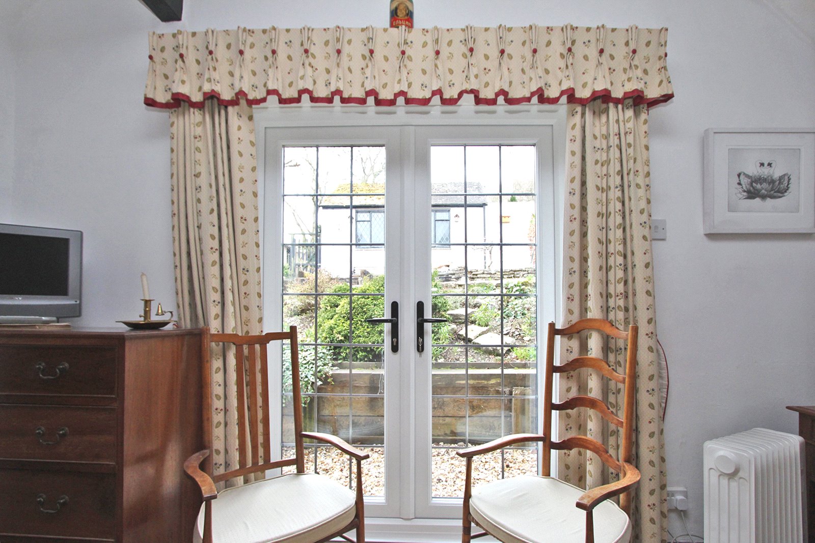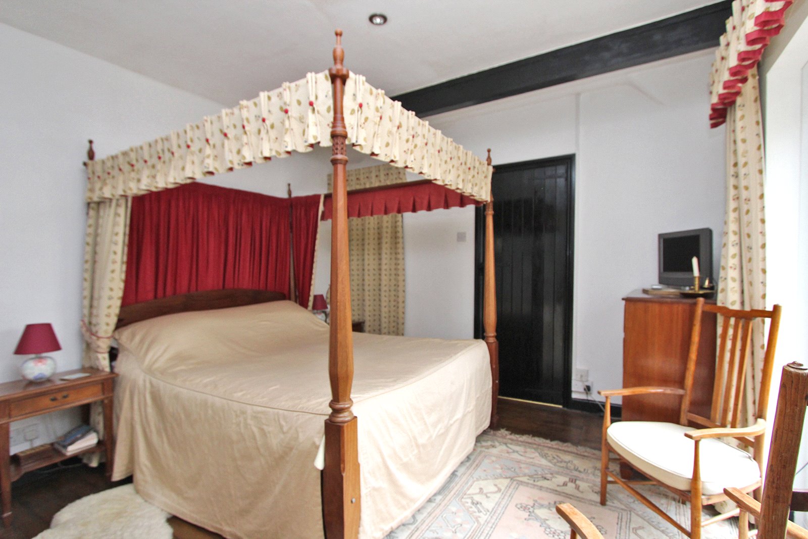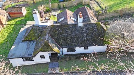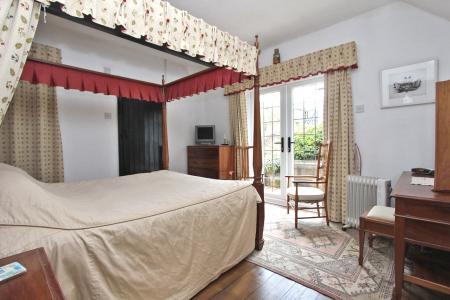Exposed wood floorboards. Radiator. Double glazed diamond leaded front aspect window and double glazed leaded UPVC doors opening to the side garden. Suitable wardrobe. Recessed lighting. Latch door to: