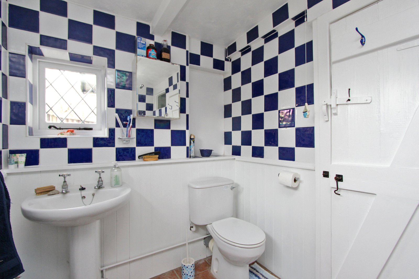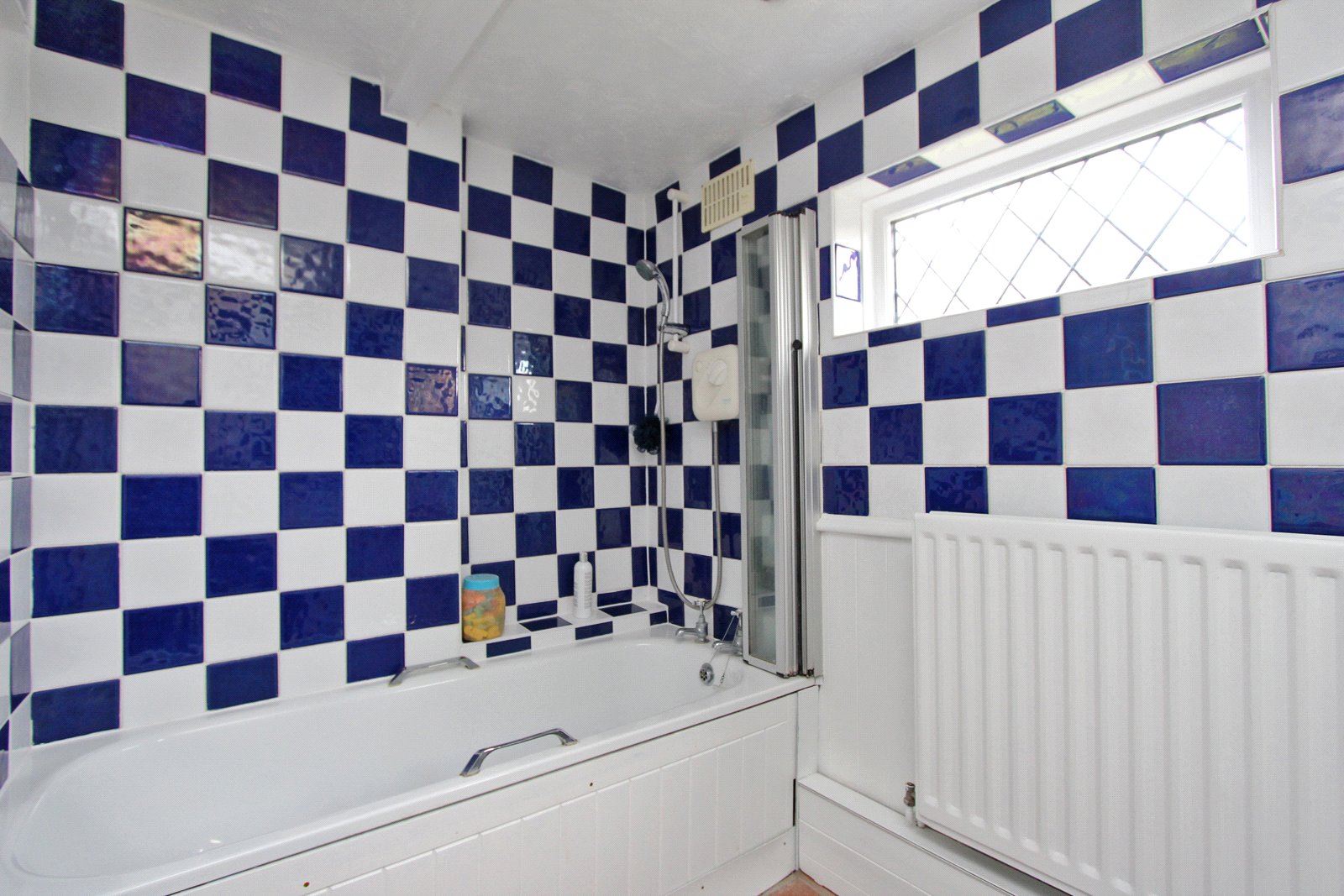 White suite comprising panelled bath with New Team shower and screen above; pedestal wash hand basin and low level w.c. Walls wood panelled up to dado rail with remainder of walls fully tiled. Recessed lighting. Double glazed diamond leaded windows to side and rear aspects.