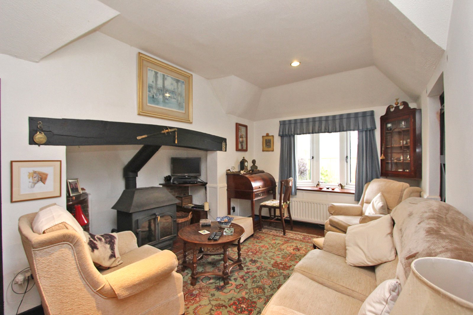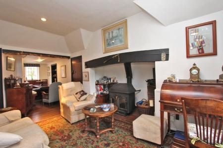 Plus inglenook fireplace with tiled hearth, wooden mantel, inset woodburner and useful built-in shelving. Exposed wood flooring. Double radiator. Recessed lighting and double glazed UPVC rear aspect bay window.