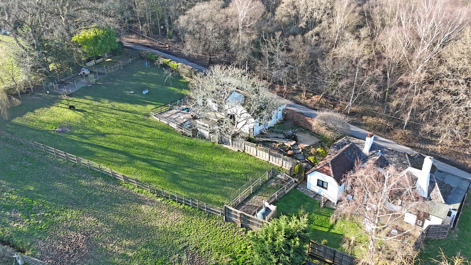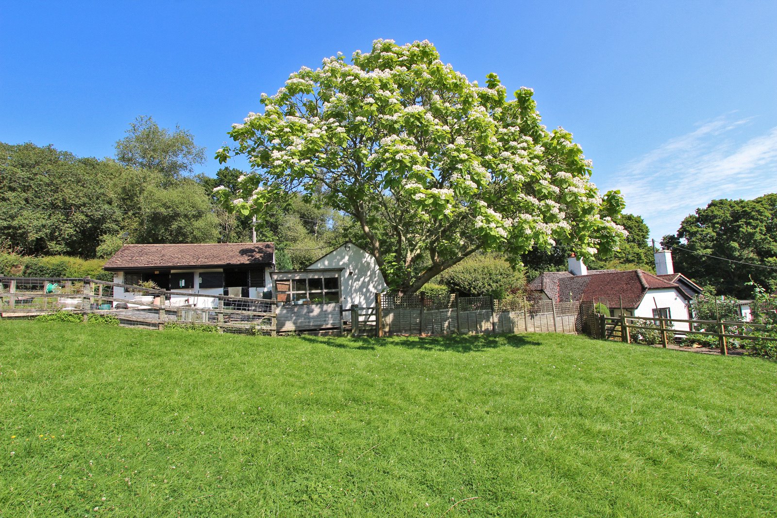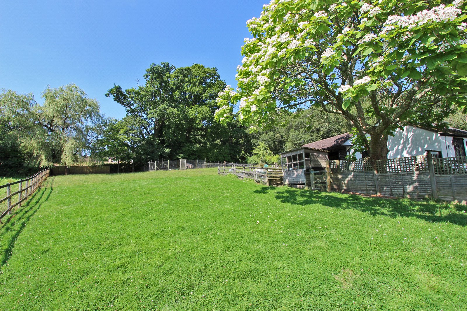 Pedestrian gate to front opens to path which leads to gate giving access to side garden which is terraced with steps leading up to the garage. Further gate gives access to the rear garden which is laid to lawn with both paved and decked sitting out areas. Well stocked border. All enclosed by fencing. Gate gives access to small paddock with fenced vegetable patch to one side. Well fenced chicken run and five bar gate opening to the good size driveway with COVERED LOG STORE.