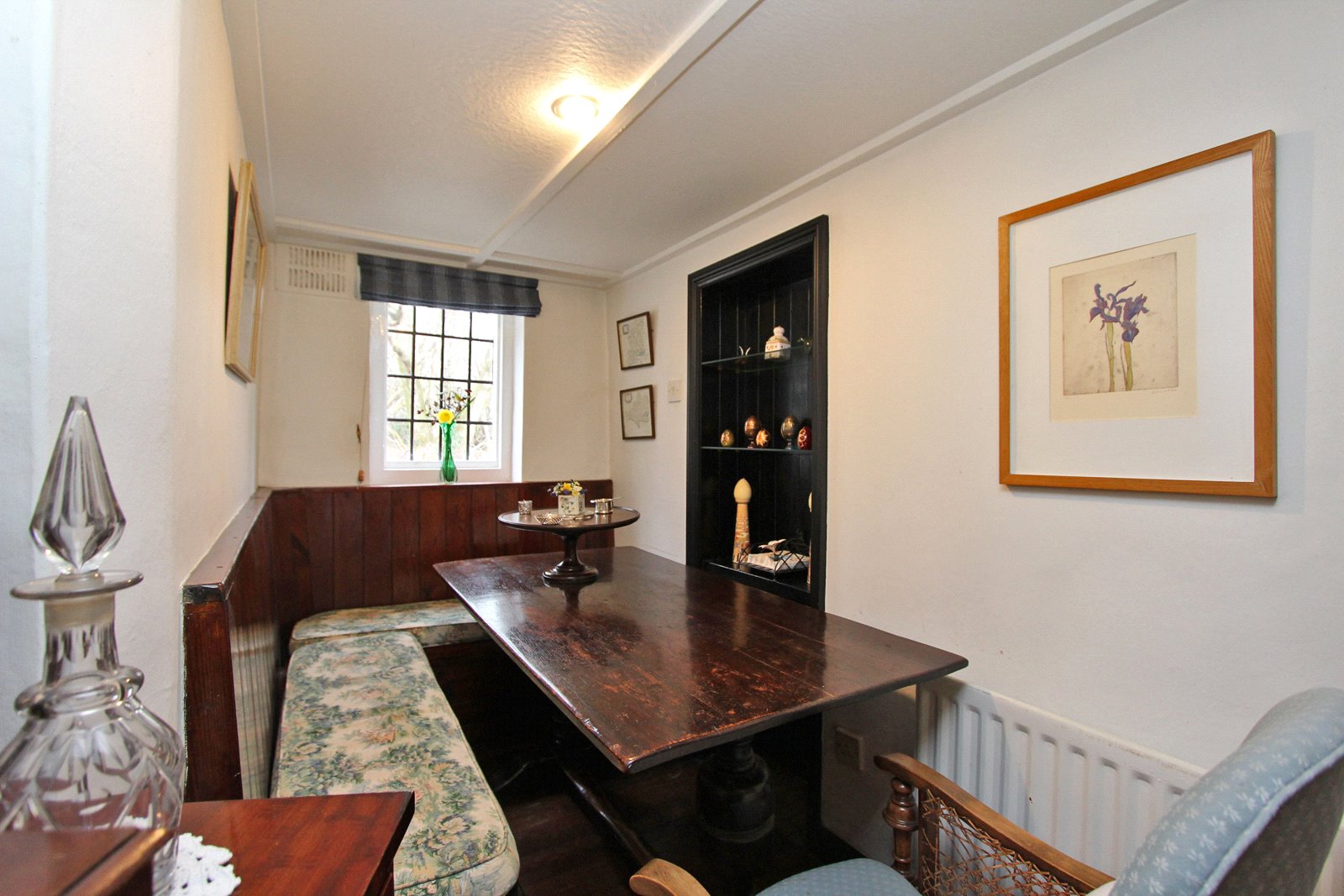Plus recessed shelving. Built-in 'L' shaped seating. Radiator. Recessed lighting. Diamond leaded front aspect window. Latch door to rear hallway and latch door to: