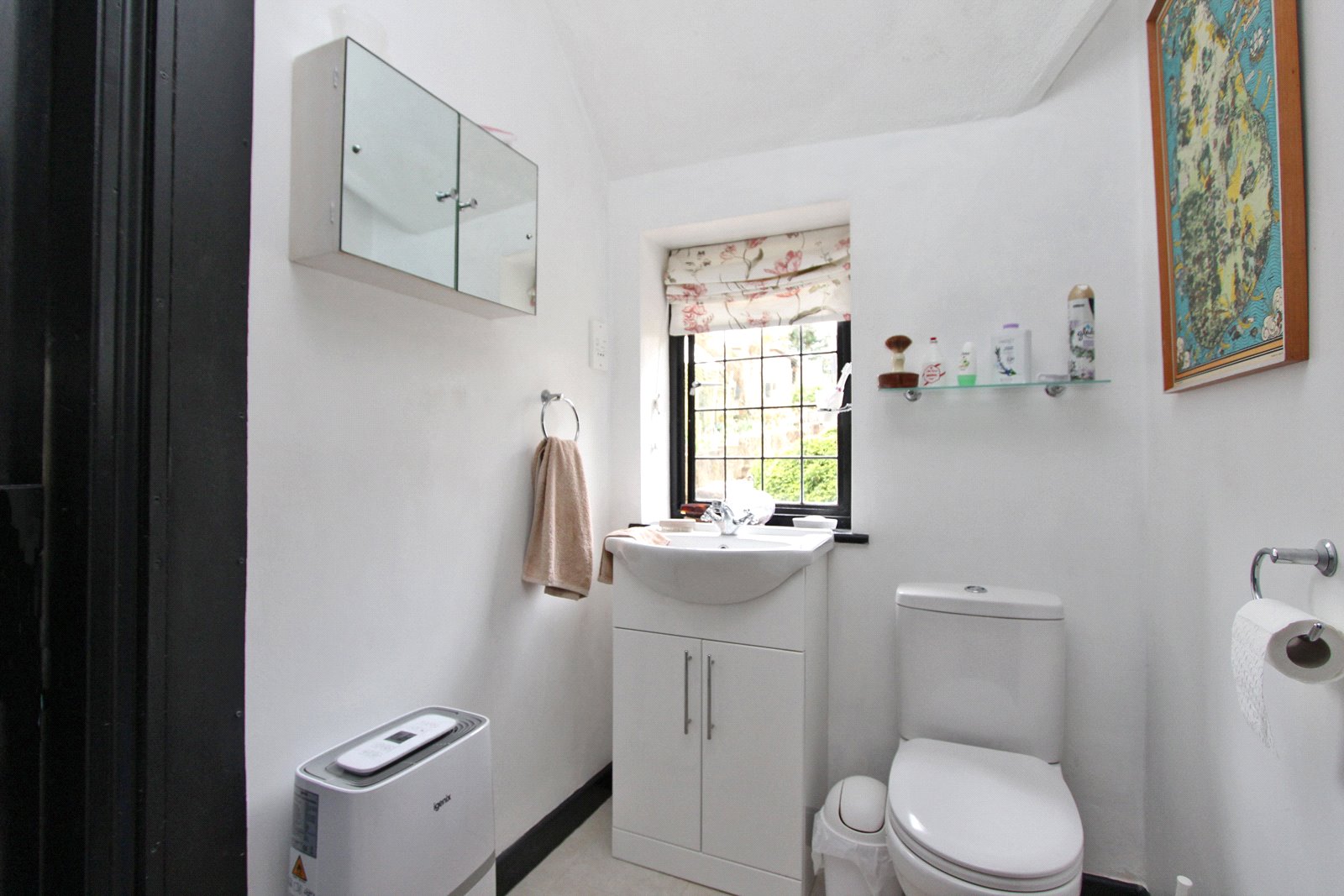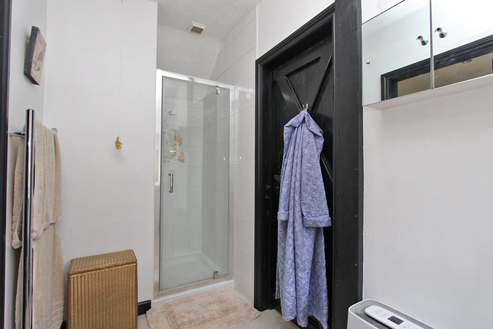 Plus fully tiled shower cubicle with Mira shower unit. Wash hand basin with cupboard under. Low level w.c. Upright ladder style chromium radiator. Shaver point. Recessed lighting. Leaded rear aspect window.