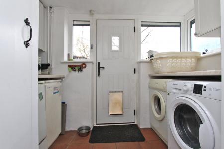 Worksurfaces to two walls with space and plumbing for automatic washing machine, tumble dryer, additional fridge and boiler for the central heating and domestic hot water under. Eye-level cupboards. Wall mounted central heating programmer. Built-in coats and broom cupboard. Recessed lighting and double glazed UPVC windows to two aspects with composite panelled door with double glazed clear centre pane and secure lockable dog flap leading to the rear garden.