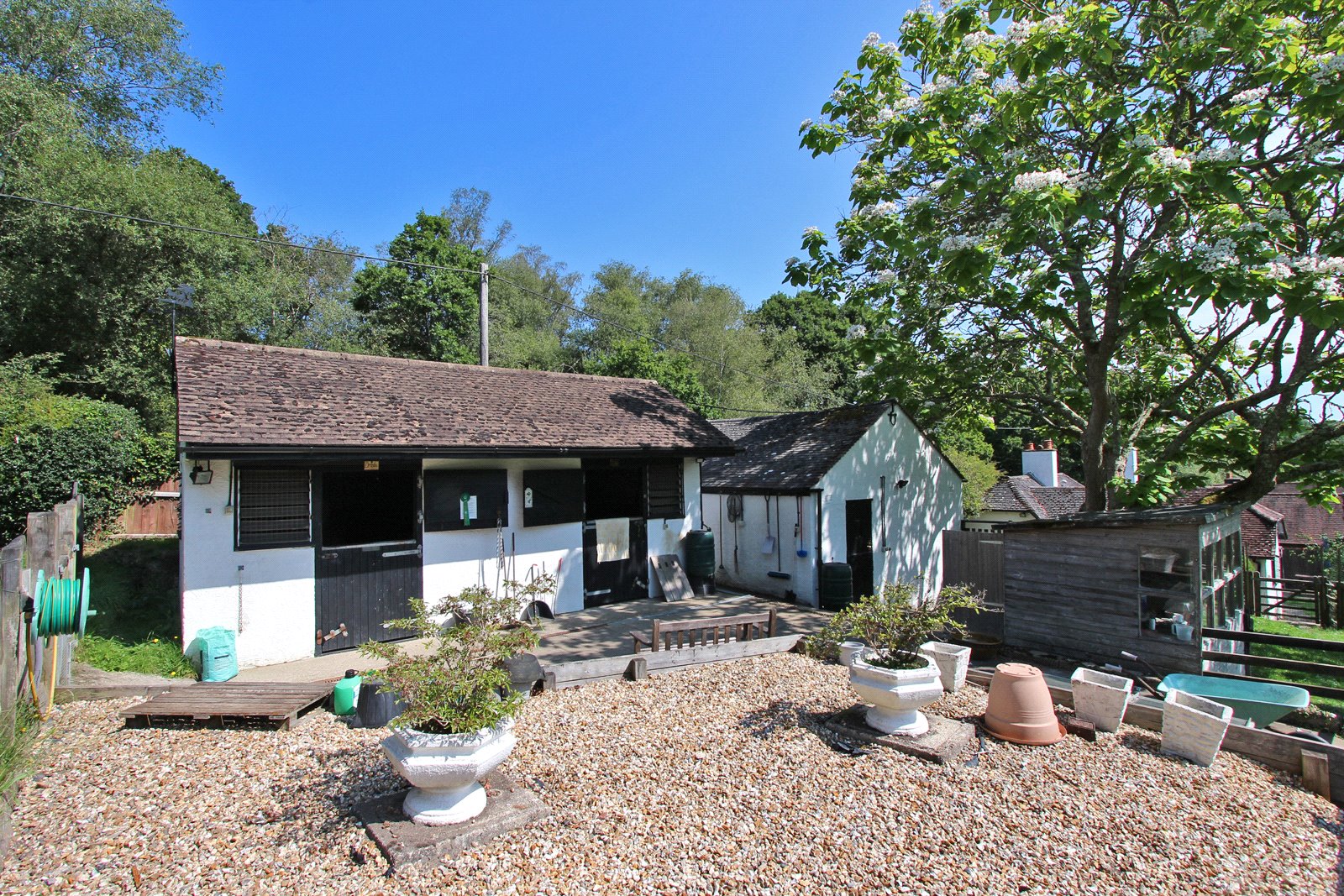 Precis of accommodation: covered porch, entrance hall, sitting room, dining area, garden room, rear hall, kitchen, bathroom, utility room, bedroom three with en suite cloakroom, bedrooms one and two with Jack & Jill shower room. Outside: double garage, shed and two stables.
