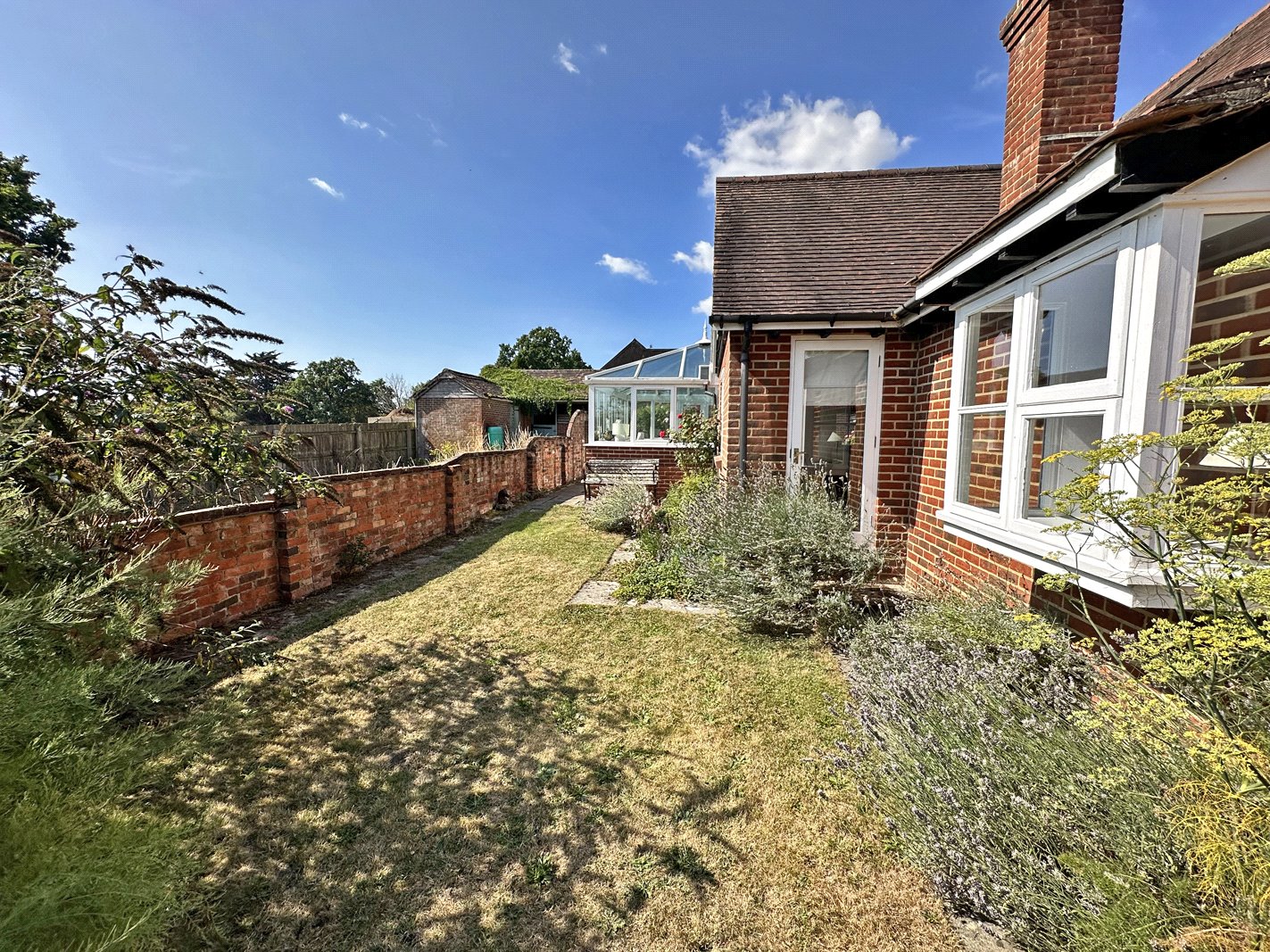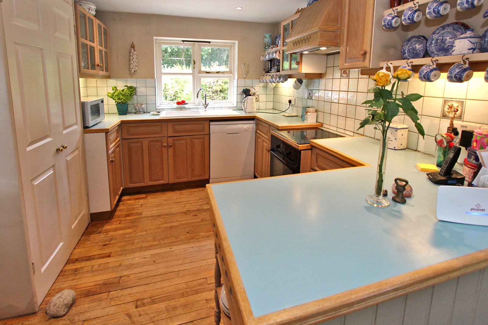 Leading off from the dining area is the well fitted kitchen with built-in oven, hob and extractor. Space and plumbing for dishwasher and tall shelved larder cupboard. Ceramic sink unit with window above overlooks the front.