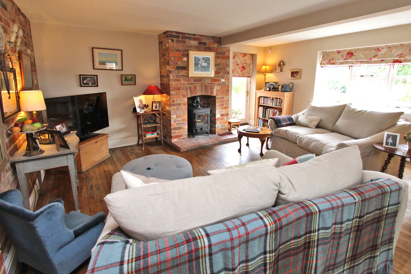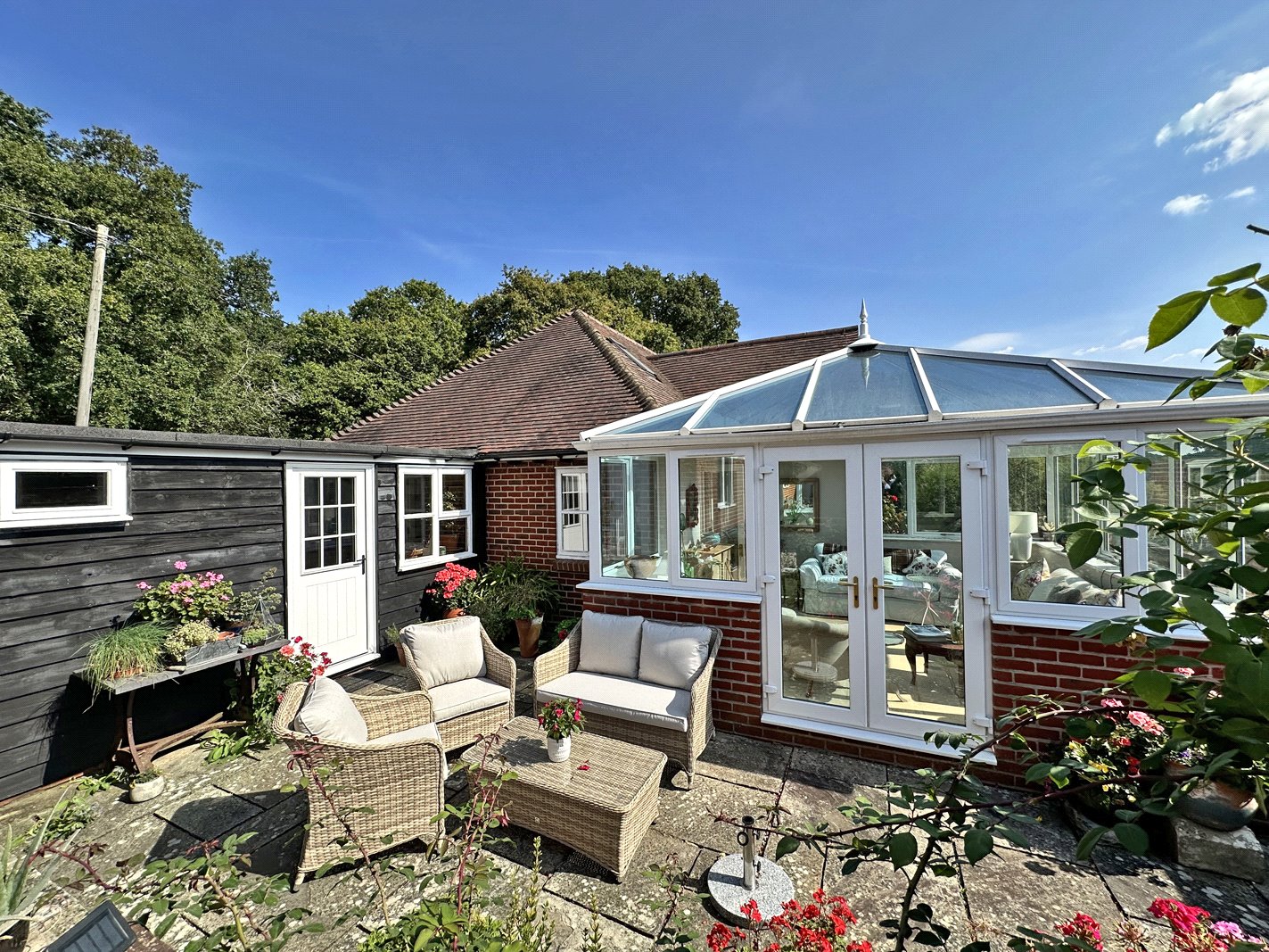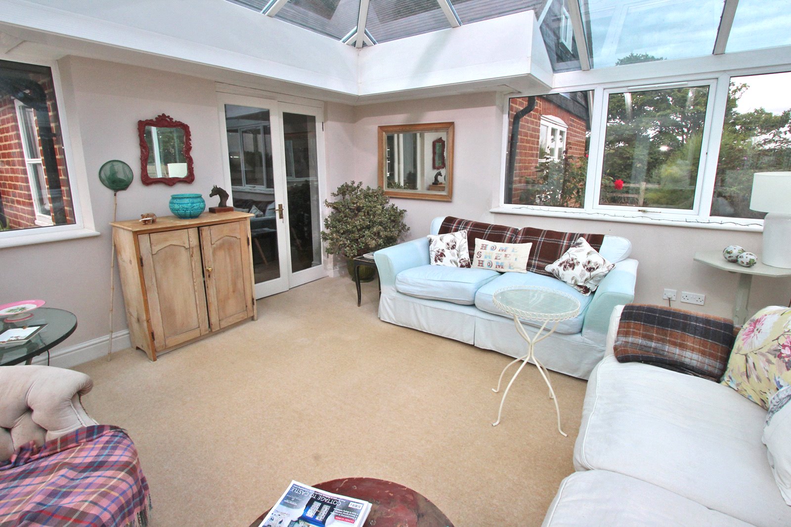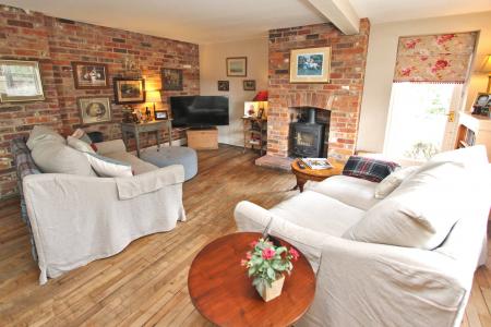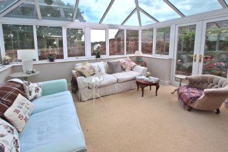 Also accessed from the hallway is the sitting/dining room with brick fireplace and woodburner and double doors open to the conservatory which is of a good size with double glazed pitched roof and double doors opening to the patio.