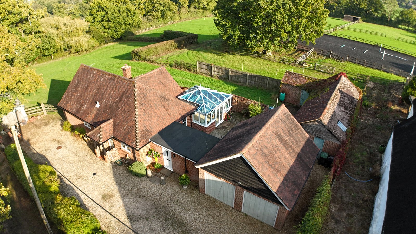 Outside: In and out loose shingle driveway leads up to the property, double garage and through to the two stables, presently as one. To the rear of the property is a lovely enclosed patio which also gives access to the workshop and very large garage.