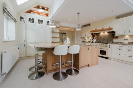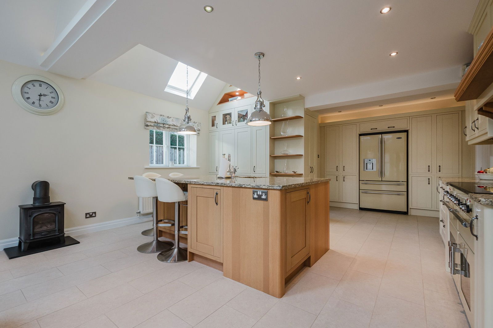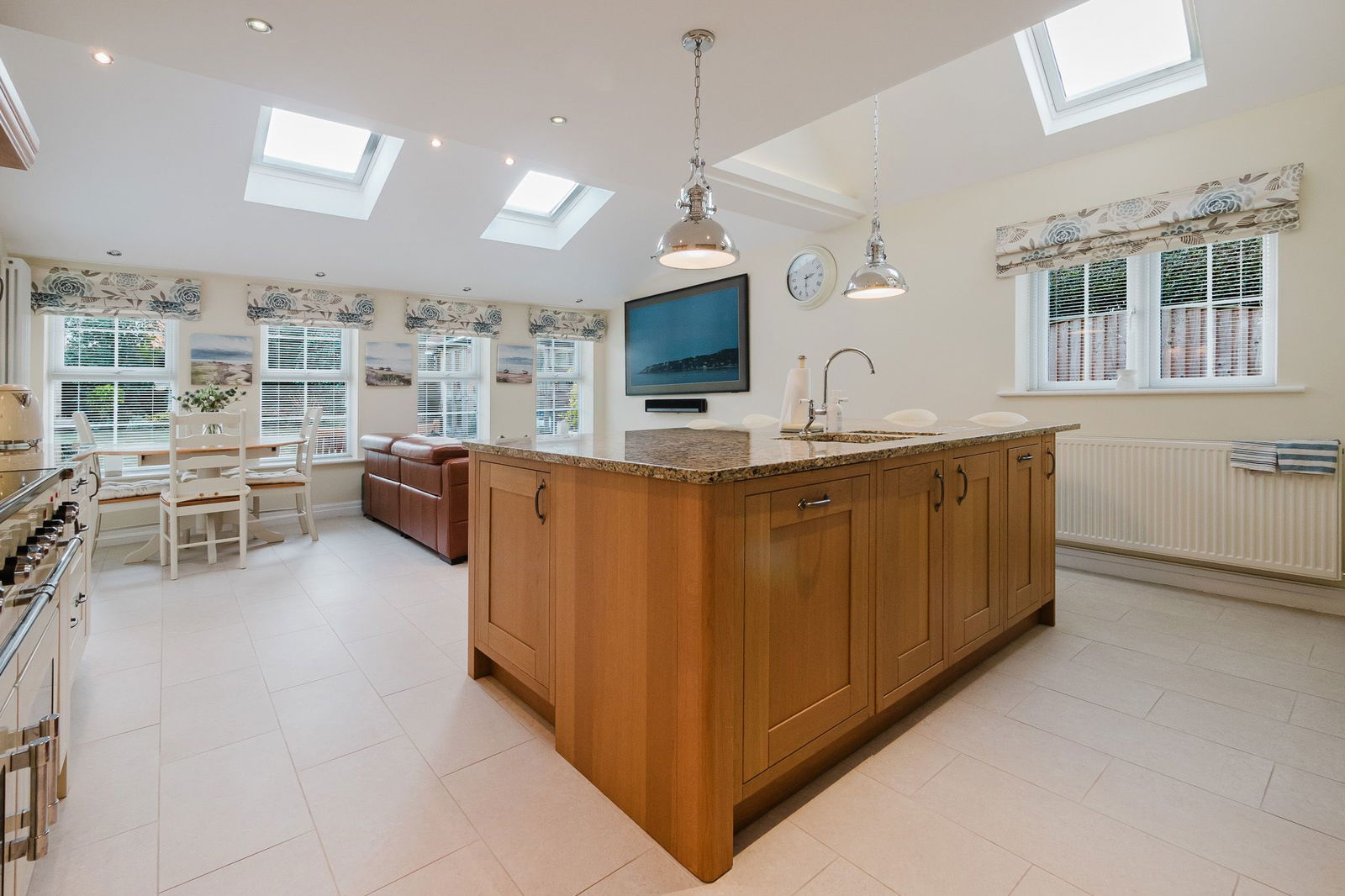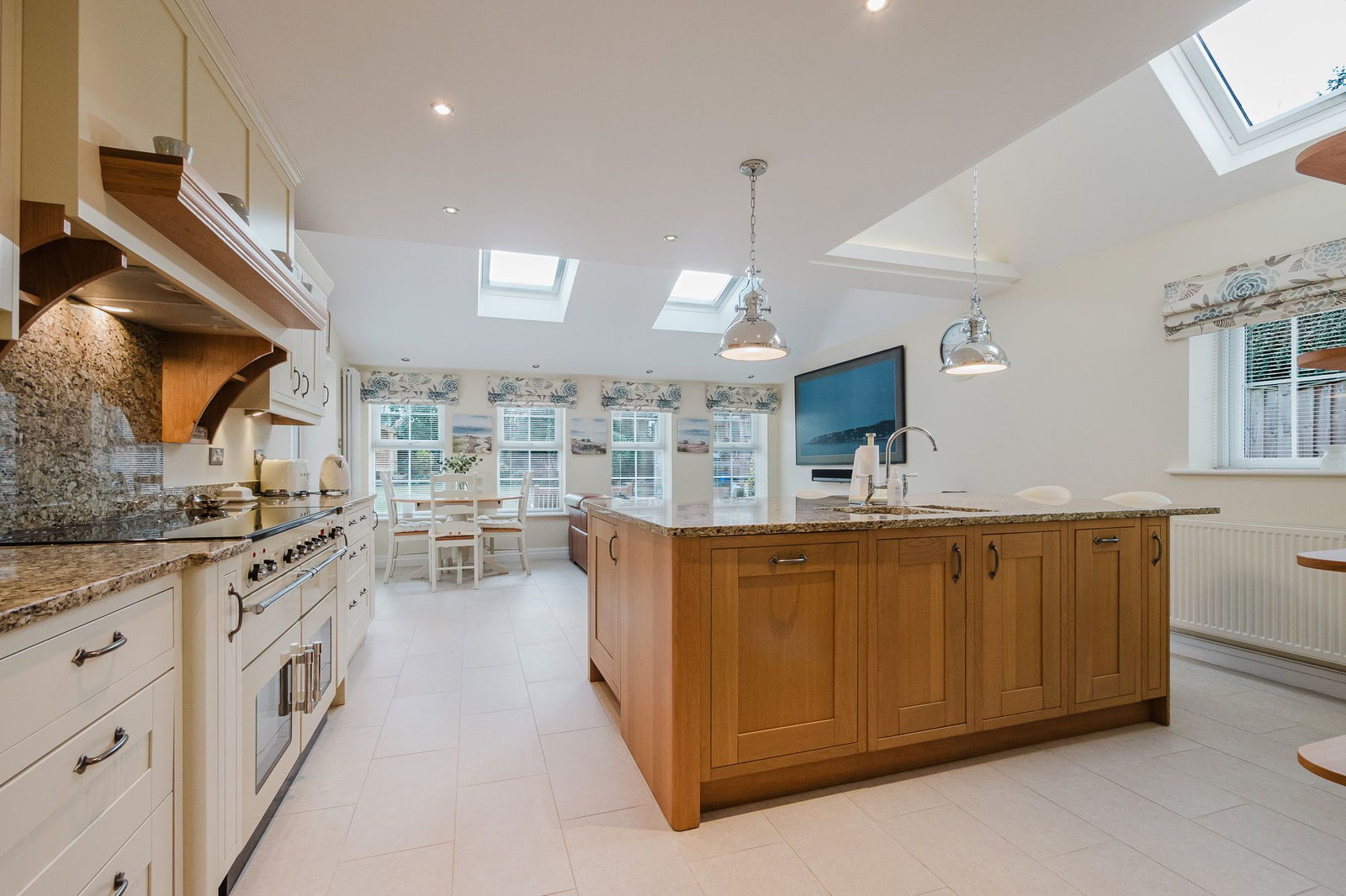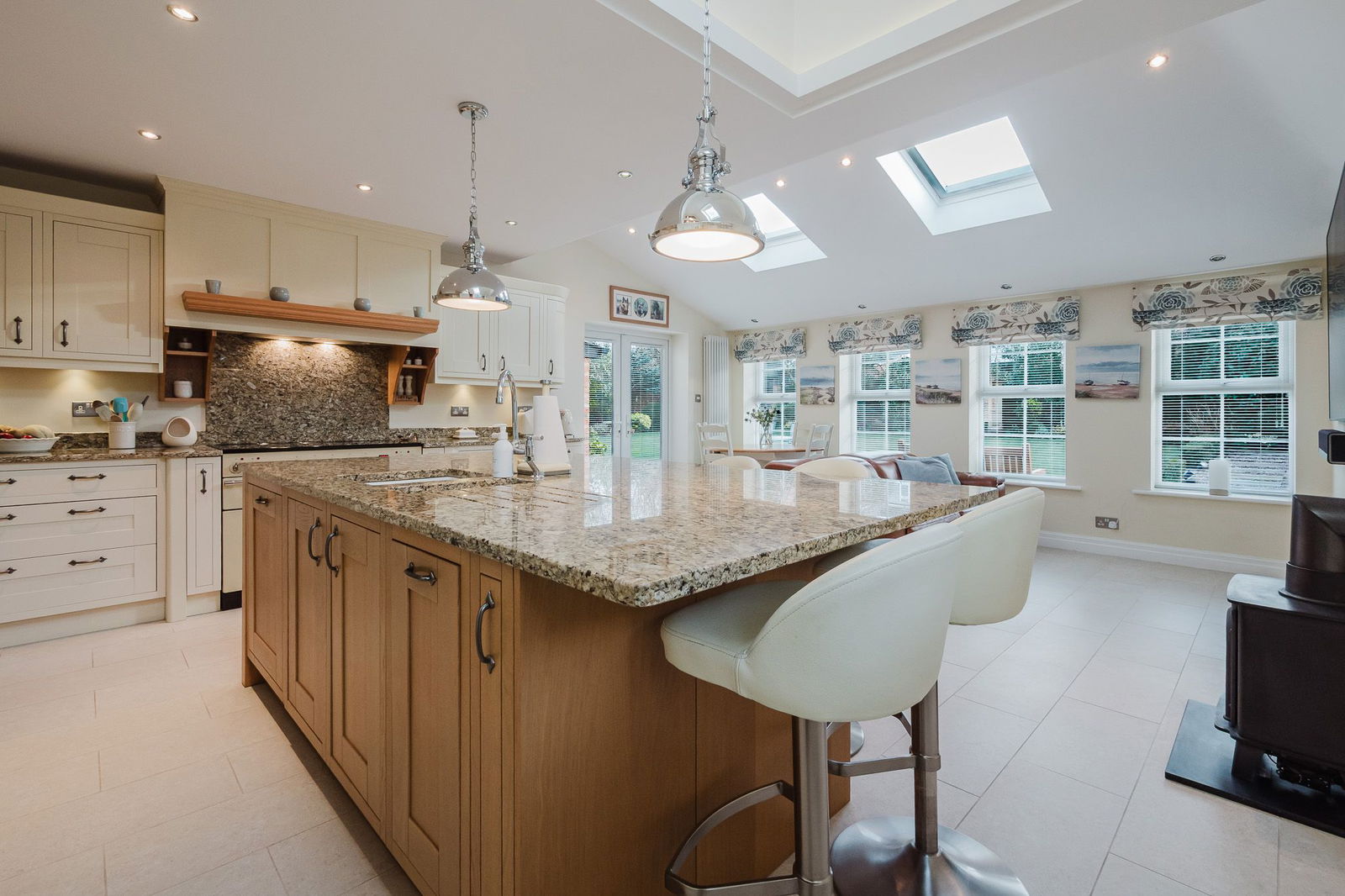 - Large open-plan family kitchen featuring granite worktops, central island, bespoke built-in cupboards, and extensive glazing flooding the room with natural light