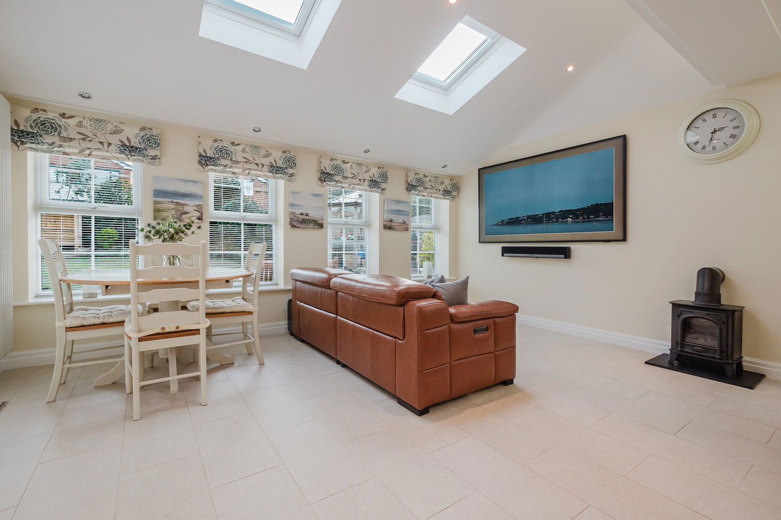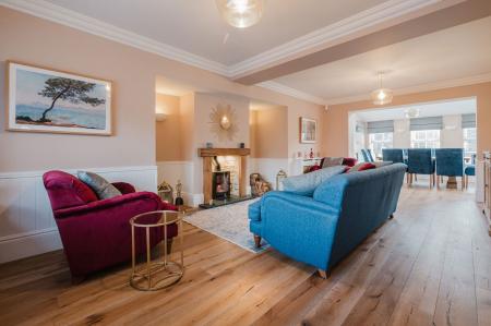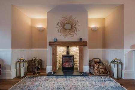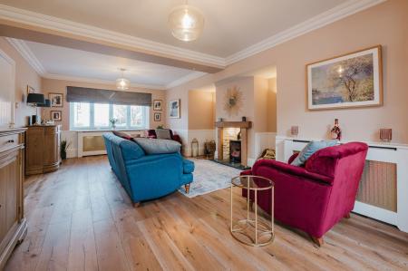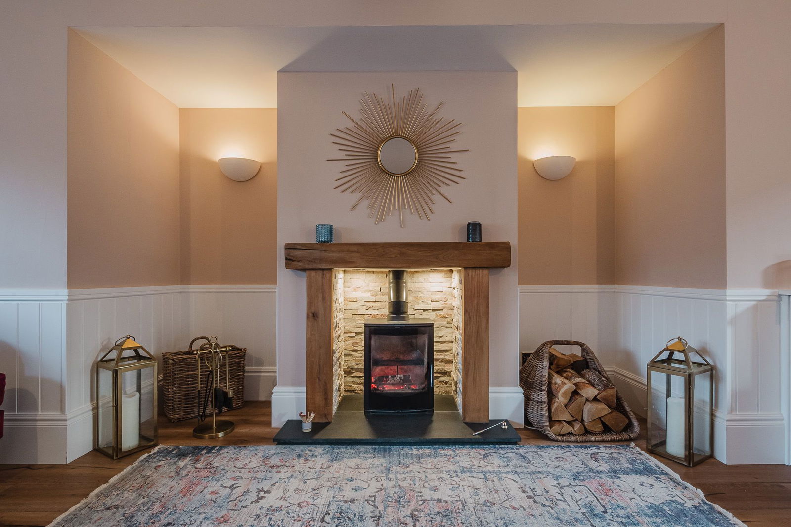 - Spacious lounge with engineered oak flooring and a log burner on a granite hearth