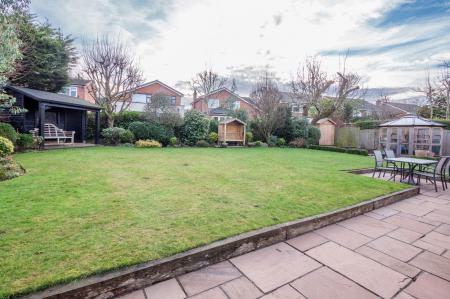 - South-facing rear garden with Indian sandstone patios, mature landscaping, and concealed lighting