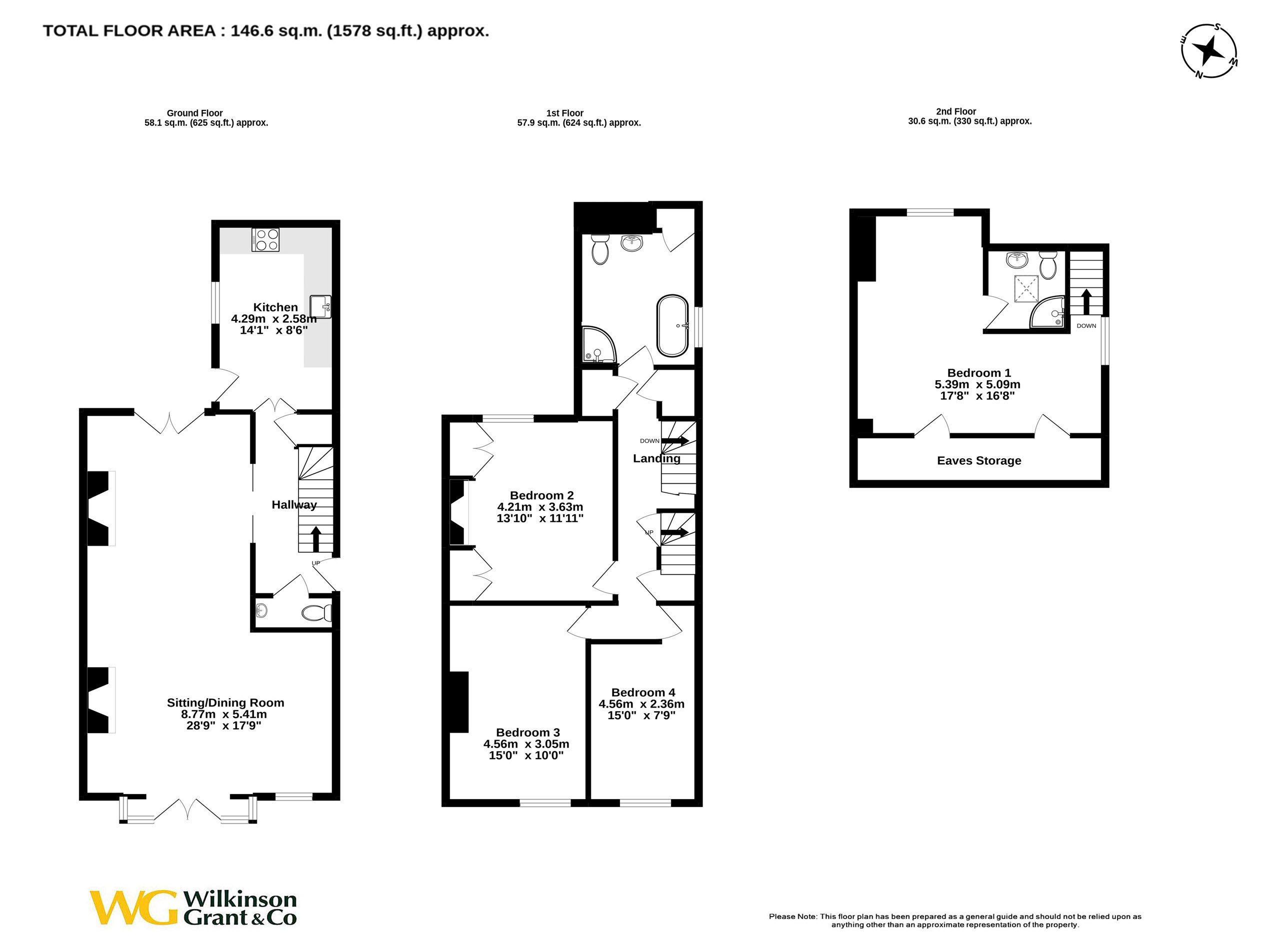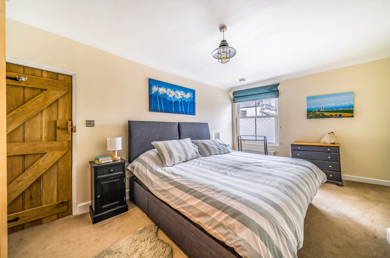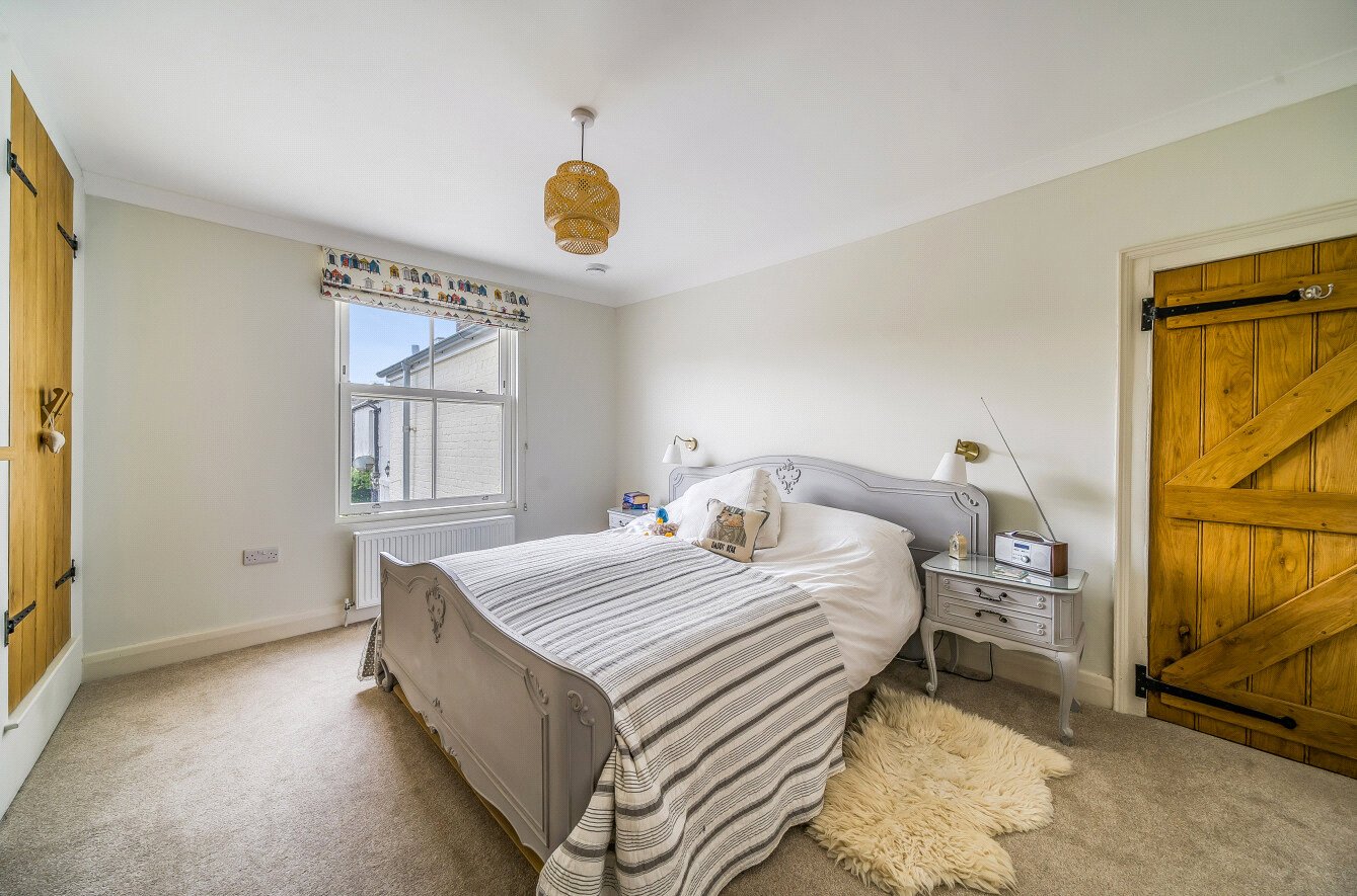On the first floor are three good-sized bedrooms with large sash windows and wooden barn-style doors. Bedroom two benefits from in-built cupboards and central fireplace with characterful mantlepiece. The spacious family bathroom includes a clawfoot bathtub with separate shower cubicle. The principal bedroom is on the second floor with south-facing skylight and has the benefit a modern en-suite shower room and eaves storage.
