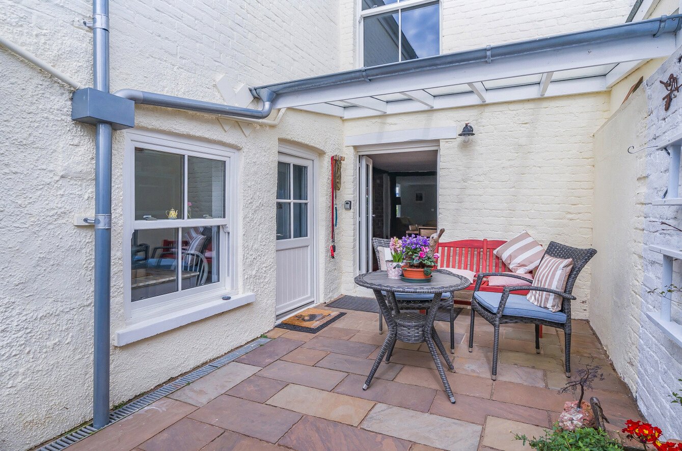 Outside, there are two courtyard areas, the rear of which is south facing and accessed from the kitchen and dining area. There is a glass canopy roof to provide some shelter and flower beds on the border.