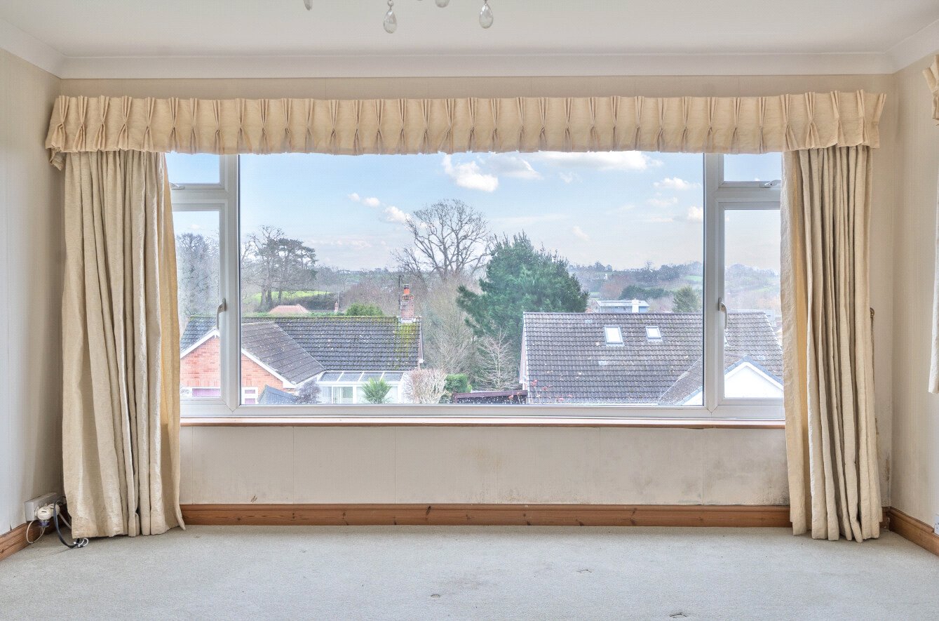 A spacious and welcoming entrance hall provides ample storage with shelving, hanging space, and access to the loft. To the right-hand side is a well-proportioned dual-aspect sitting room, enjoying a pleasant elevated outlook over the surrounding countryside and the quiet cul-de-sac, complemented by a feature fireplace with coal-effect gas fire.