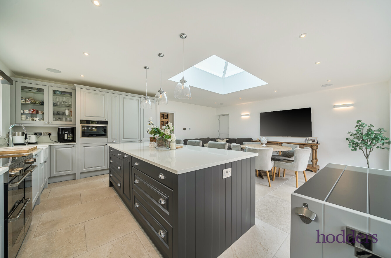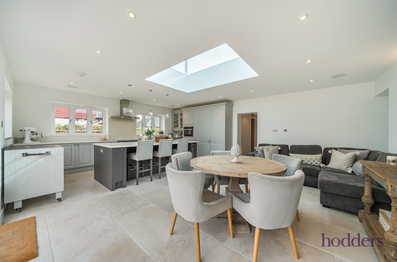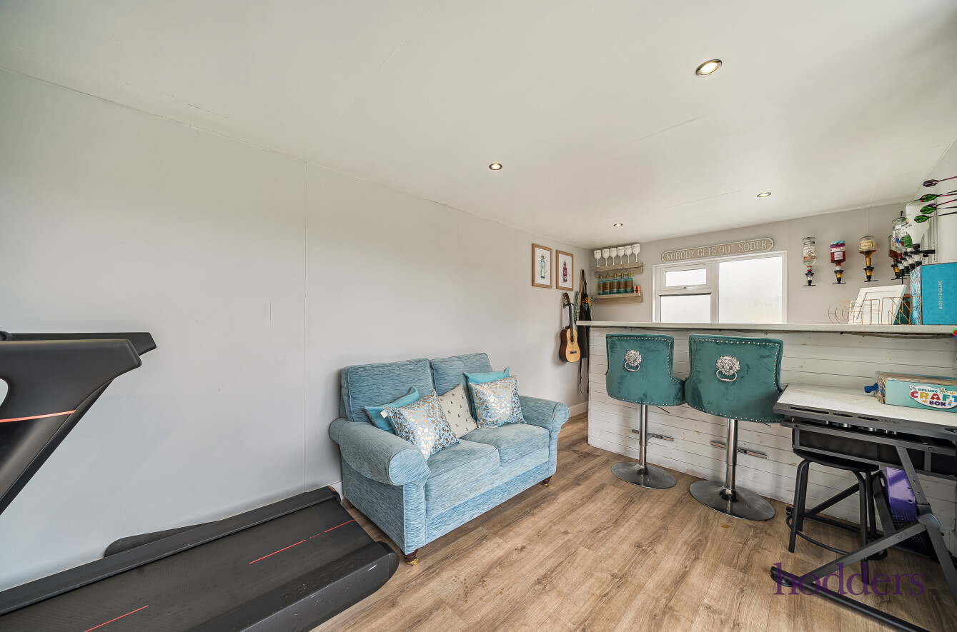 Upon entering the property, you are welcomed by a generous entrance hallway featuring bespoke fitted storage, immediately setting the tone for the quality and thoughtful design found throughout the home. The heart of the property is the stunning open-plan kitchen and dining area. This impressive space boasts a central island with breakfast bar, a large skylight, dual-aspect windows, and bi-fold doors that flood the room with natural light while creating seamless indoor-outdoor living. The spacious reception room provides a cosy yet elegant retreat, complete with a wood-burning stove, French doors leading to the garden, and tasteful neutral décor. All three bedrooms are well-proportioned and are served by a stylish family bathroom fitted with a modern white suite, featuring both a bath and a separate shower. Externally, the property continues to impress. The generous garden offers both lawn and patio areas, ideal for outdoor dining and entertaining. A versatile outbuilding with patio doors and a built-in bar provides excellent additional space, perfect for use as a garden room, home office, or entertainment area. A private driveway offers convenient off-street parking. The home has been fully modernised to a high standard throughout, with significant upgrades including new windows, a redesigned driveway and entrance, full external rendering, and a newly laid patio. Internally, the property benefits from underfloor heating throughout, controlled b
