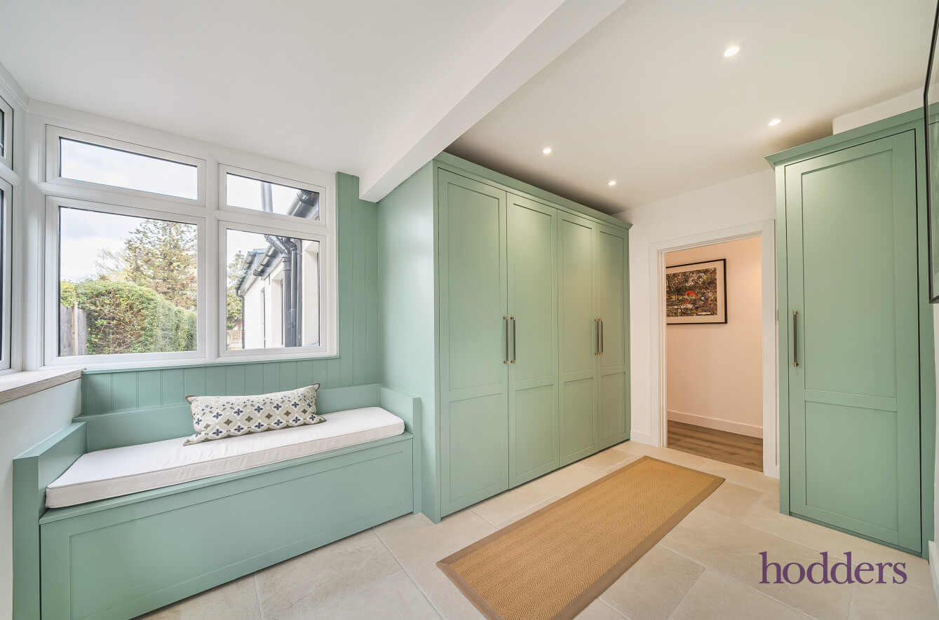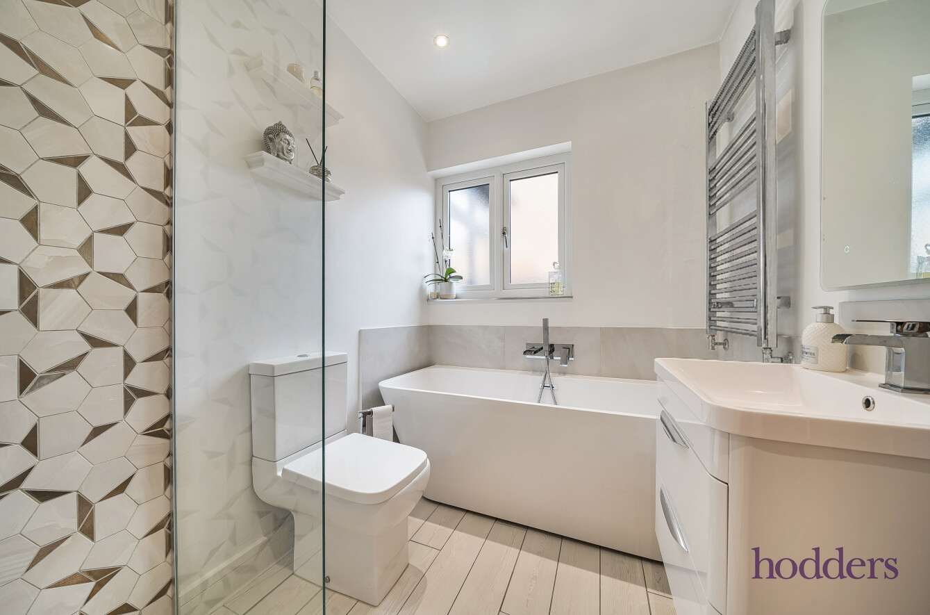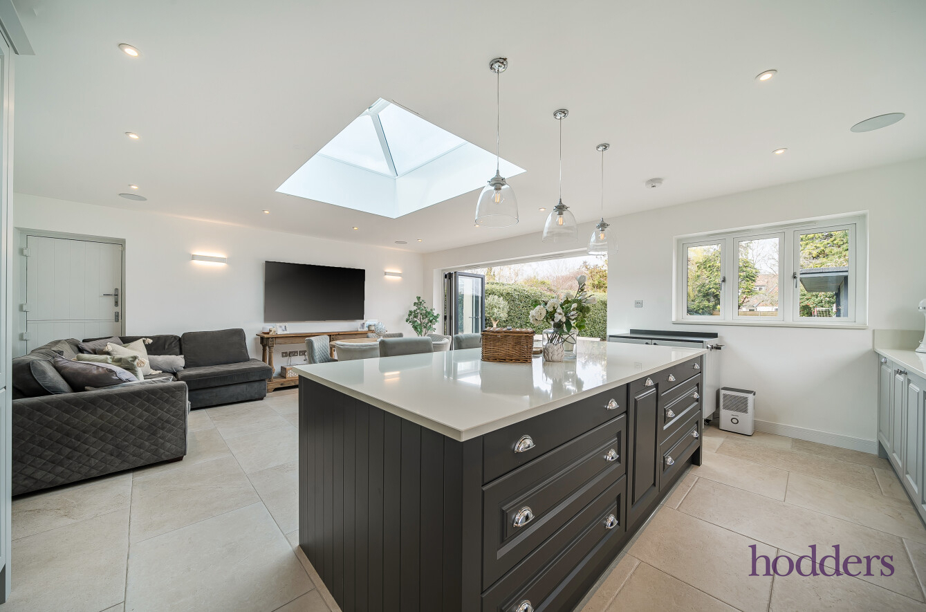 Upon entering the property, you are welcomed by a generous entrance hallway featuring bespoke fitted storage, immediately setting the tone for the quality and thoughtful design found throughout the home. The heart of the property is the stunning open-plan kitchen and dining area. This impressive space boasts a central island with breakfast bar, a large skylight, dual-aspect windows, and bi-fold doors that flood the room with natural light while creating seamless indoor-outdoor living. The spacious reception room provides a cosy yet elegant retreat, complete with a wood-burning stove, French doors leading to the garden, and tasteful neutral décor. All three bedrooms are well-proportioned and are served by a stylish family bathroom fitted with a modern white suite, featuring both a bath and a separate shower. Externally, the property continues to impress. The generous garden offers both lawn and patio areas, ideal for outdoor dining and entertaining. A versatile outbuilding with patio doors and a built-in bar provides excellent additional space, perfect for use as a garden room, home office, or entertainment area. A private driveway offers convenient off-street parking. The home has been fully modernised to a high standard throughout, with significant upgrades including new windows, a redesigned driveway and entrance, full external rendering, and a newly laid patio. Internally, the property benefits from underfloor heating throughout, controlled b