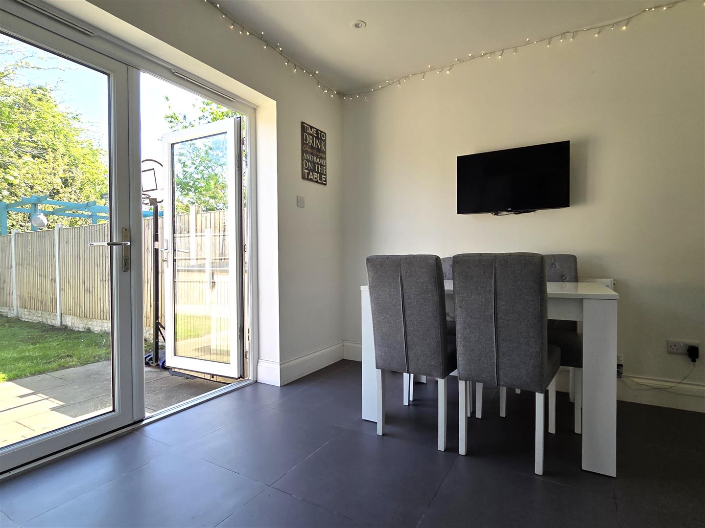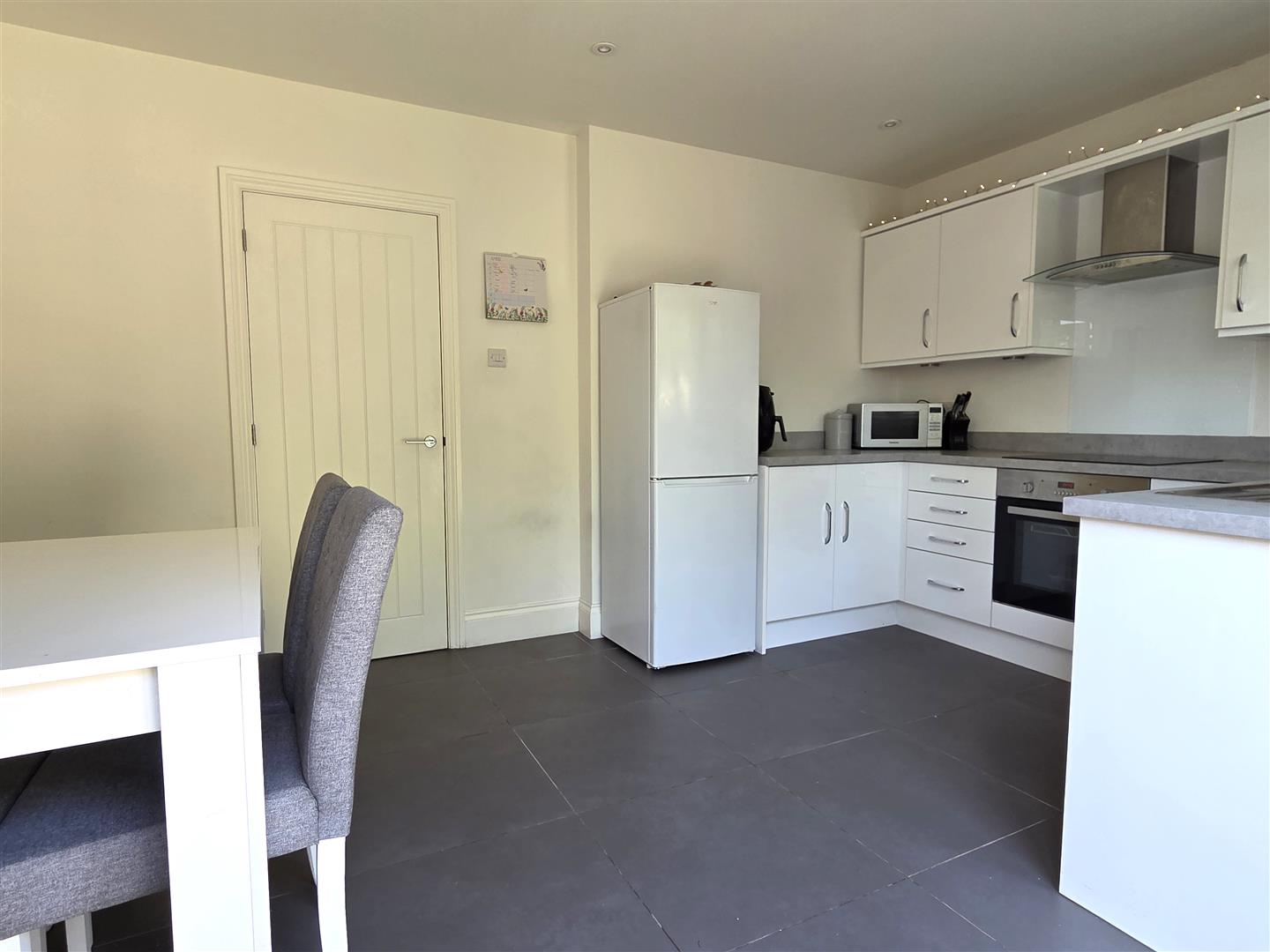 Dining Kitchen - 4.47m x 3.15m (14'8 x 10'4) - Modern family Dining Kitchen. UPVC double glazed opening window overlooks the rear garden with fitted window blinds. UPVC double glazed double opening French doors overlook and give direct access to the rear garden. Range of eye and low level cupboards and drawers. Stainless steel single drainer sink unit with a centre mixer tap. Set in work surfaces with matching splash back and concealed down lighting. Built in appliances comprise: Four ring electric induction hob with a glazed splash back. Stainless steel illuminated extractor canopy above. Electric oven and grill. Integrated slimline dishwasher with a matching cupboard front. Space for a fridge/freezer. Plumbing for a washing machine. Wall mounted concealed Ideal Logic combi gas central heating boiler. Inset ceiling spot lights. Single panel radiator. Television aerial point. Telephone point.