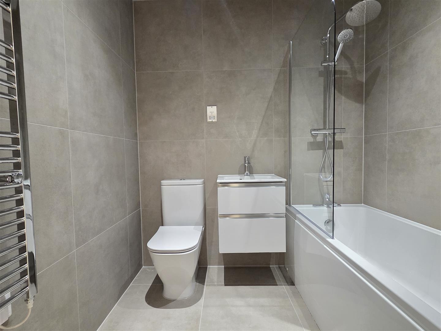 Bathroom/Wc - 1.96m x 1.73m (6'5 x 5'8) - Principal bathroom comprising a brand new three piece white suite. Panelled bath with centre mixer taps. Glazed screen and a plumbed over bath shower with a separate hand held shower attachment. Roca vanity wash hand basin with a mixer tap and drawers below. Wall mounted shaving point. Roca low level WC completes the suite. Tiled walls and floor with underfloor heating. Chrome electrically heated ladder towel rail. Inset ceiling spot lights and extractor fan.