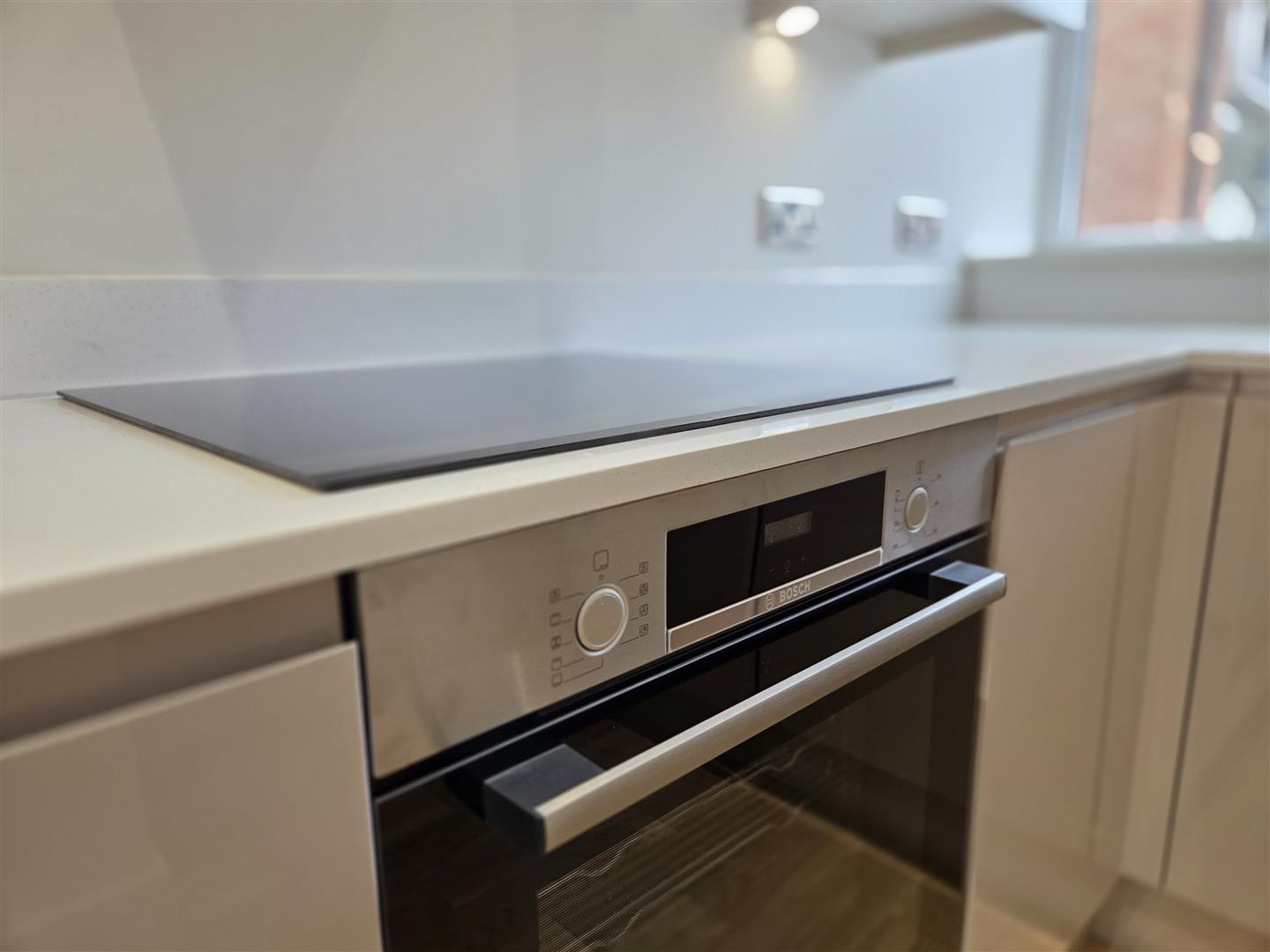 Kitchen - 3.53m x 2.49m max (11'7 x 8'2 max) - (max L shaped measurements) UPVC double glazed window overlooks the front of the development with views of Hall Park Centre. Side opening lights. Good range of new wall and floor mounted cupboards and drawers. One and a half bowl sink unit with a centre mixer tap with instant boiling water and moulded drainer. Set in working surfaces with matching splash back and concealed downlighting. Built in appliances comprise: Bosch four ring electric induction with a Bosch illuminated extractor above. Bosch electric oven and grill below. Integrated Indesit fridge/freezer, slimline Bosch dishwasher and Bosch washer/dryer, all with matching cupboard fronts. Inset ceiling spot lights and extractor fan. Matching wood laminate flooring with electric under floor heating.
