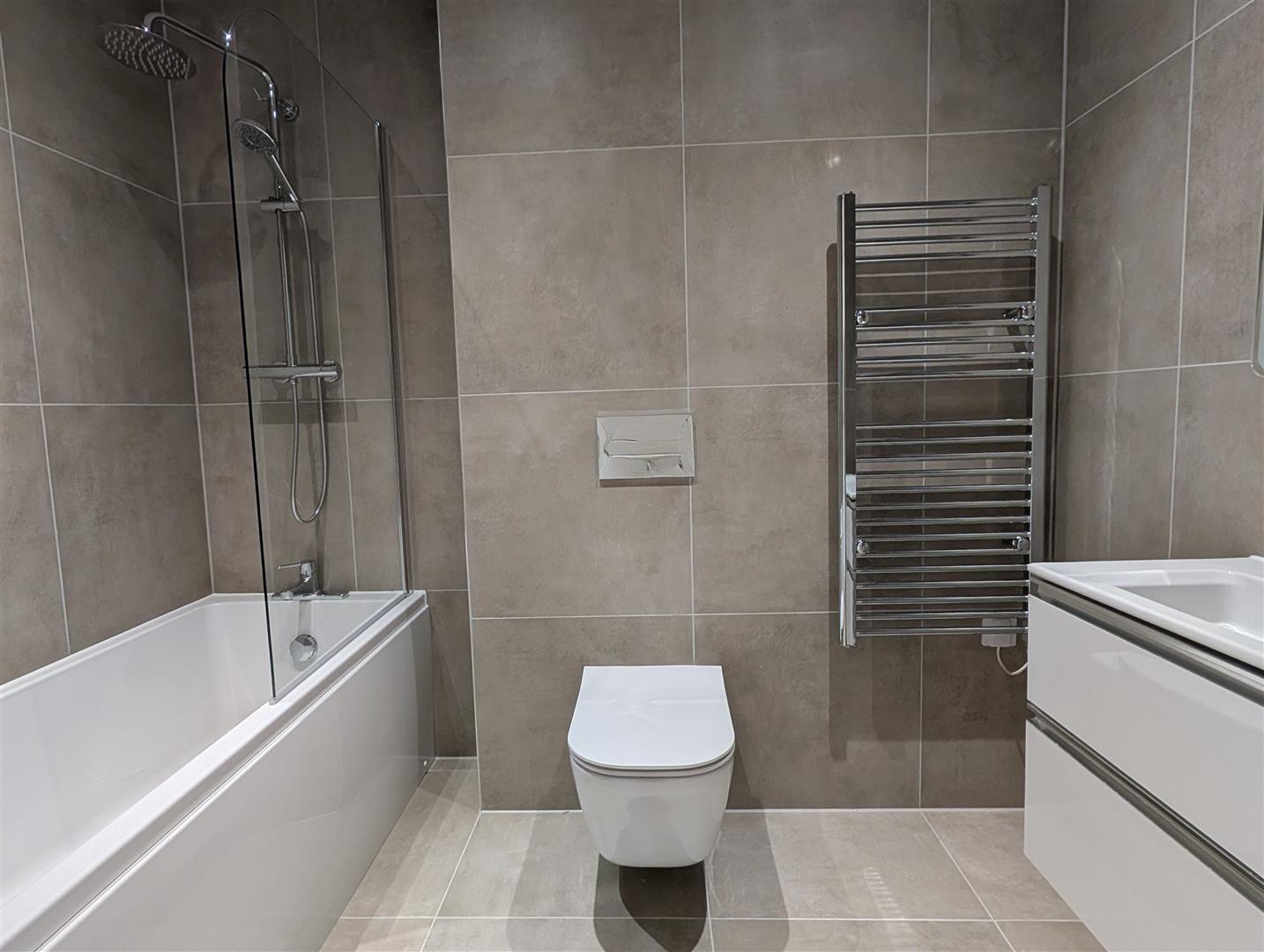 Fully tiled in matching porcelain using muted colours