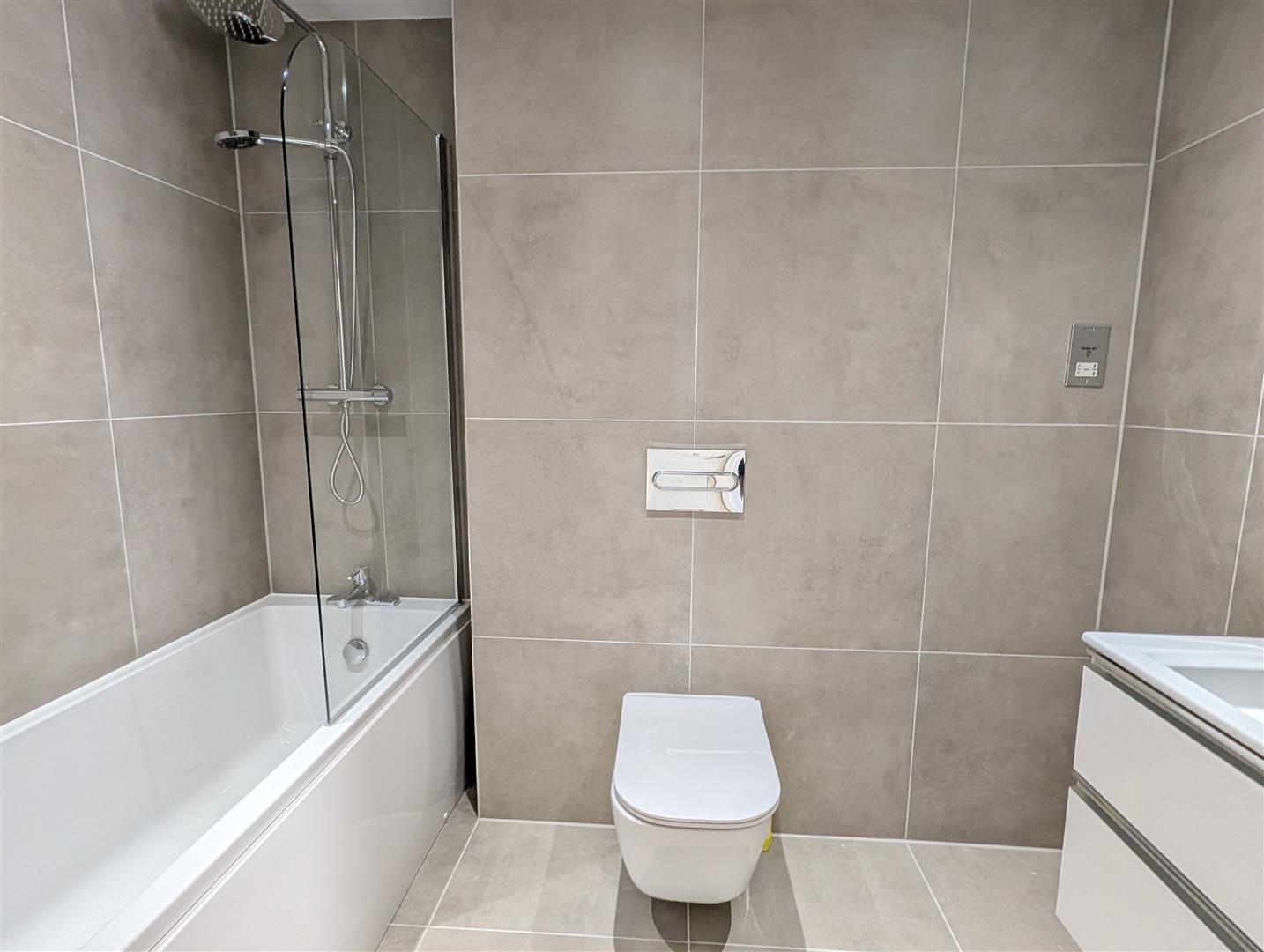 Fully tiled in matching porcelain using muted colours